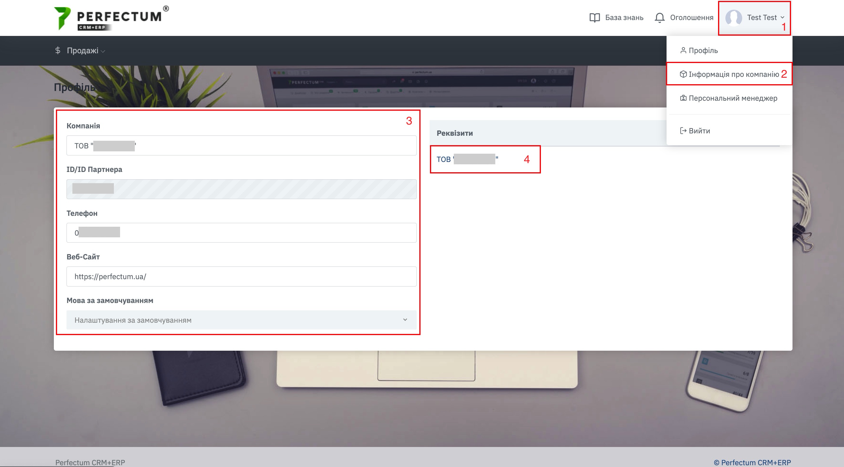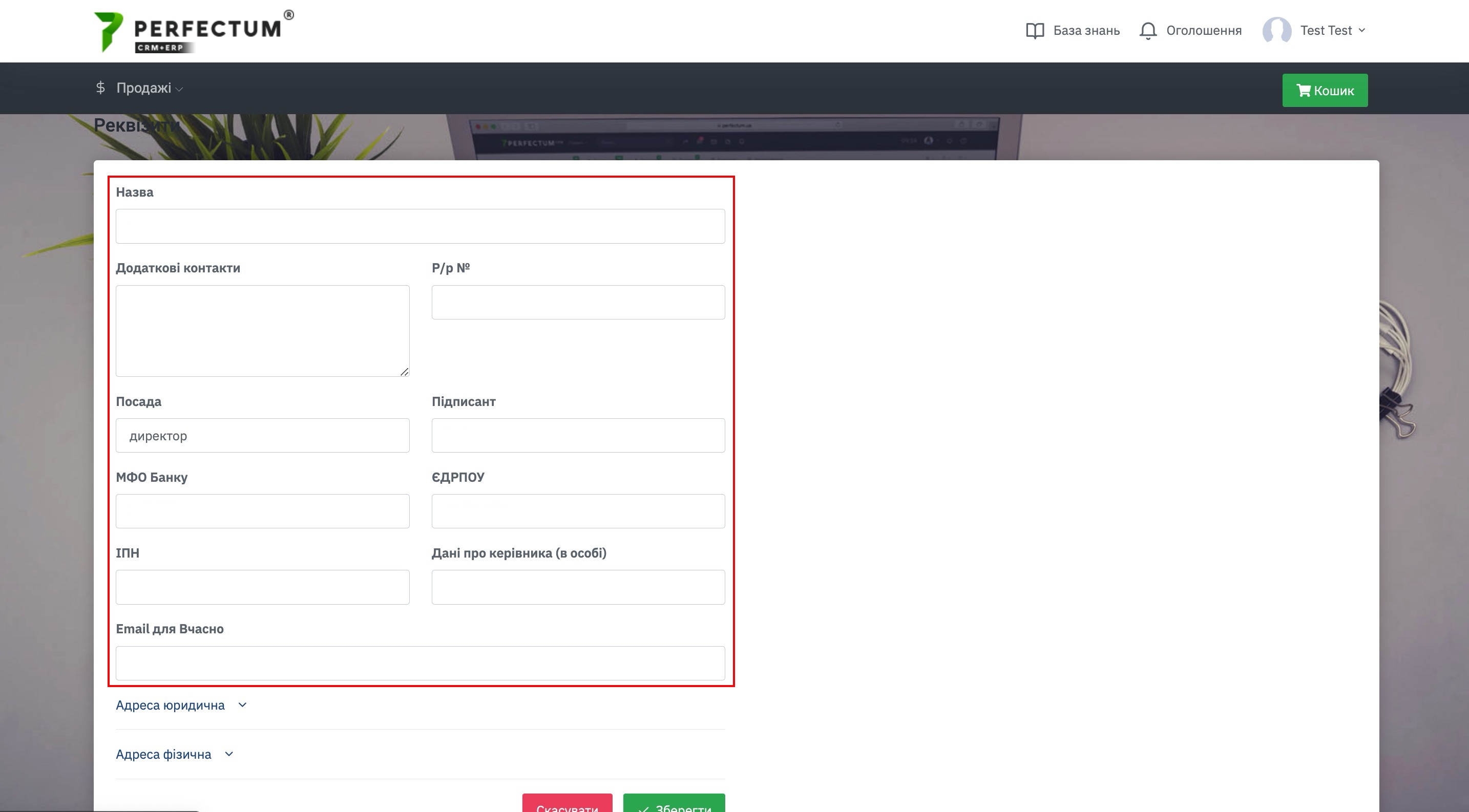 Після авторизації до кабінету Perfectum, перед початком покупок Вам необхідно вказати реквізити компанії.