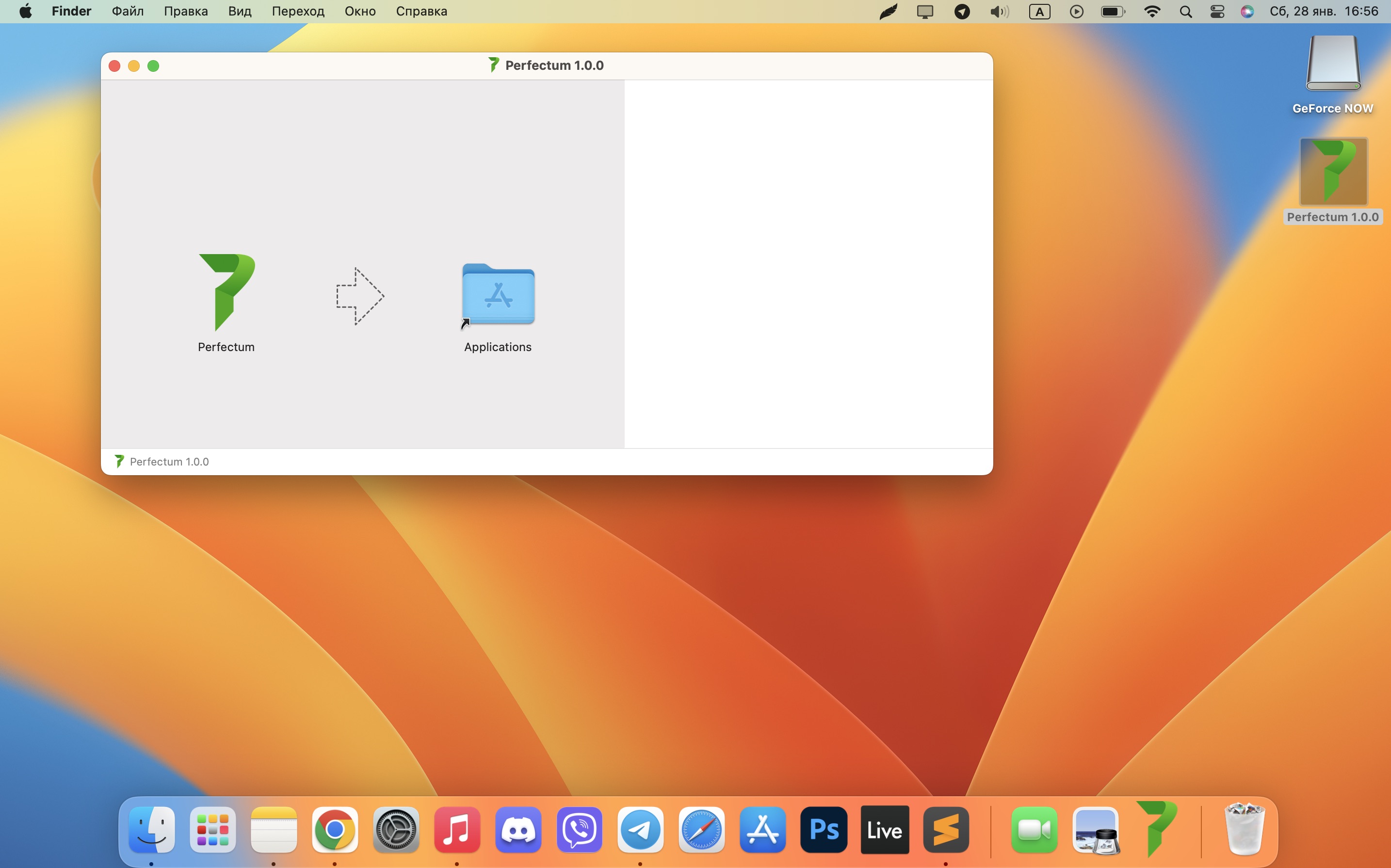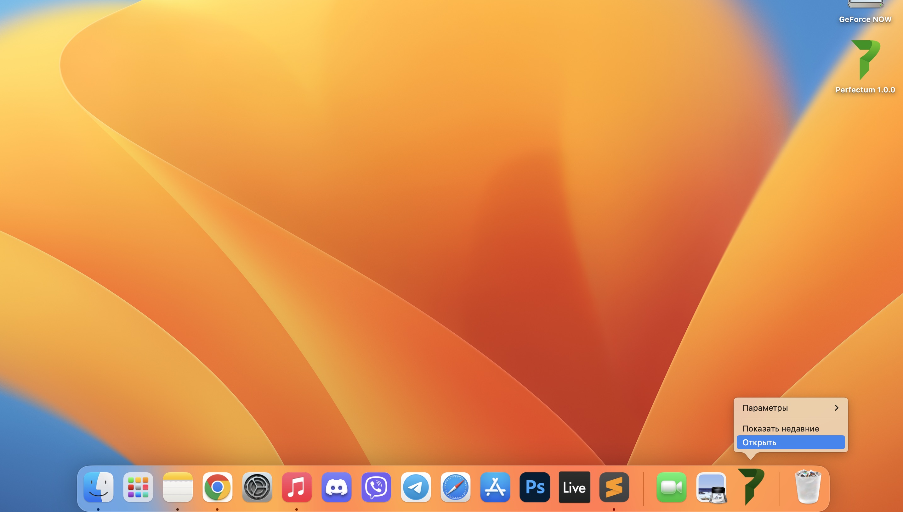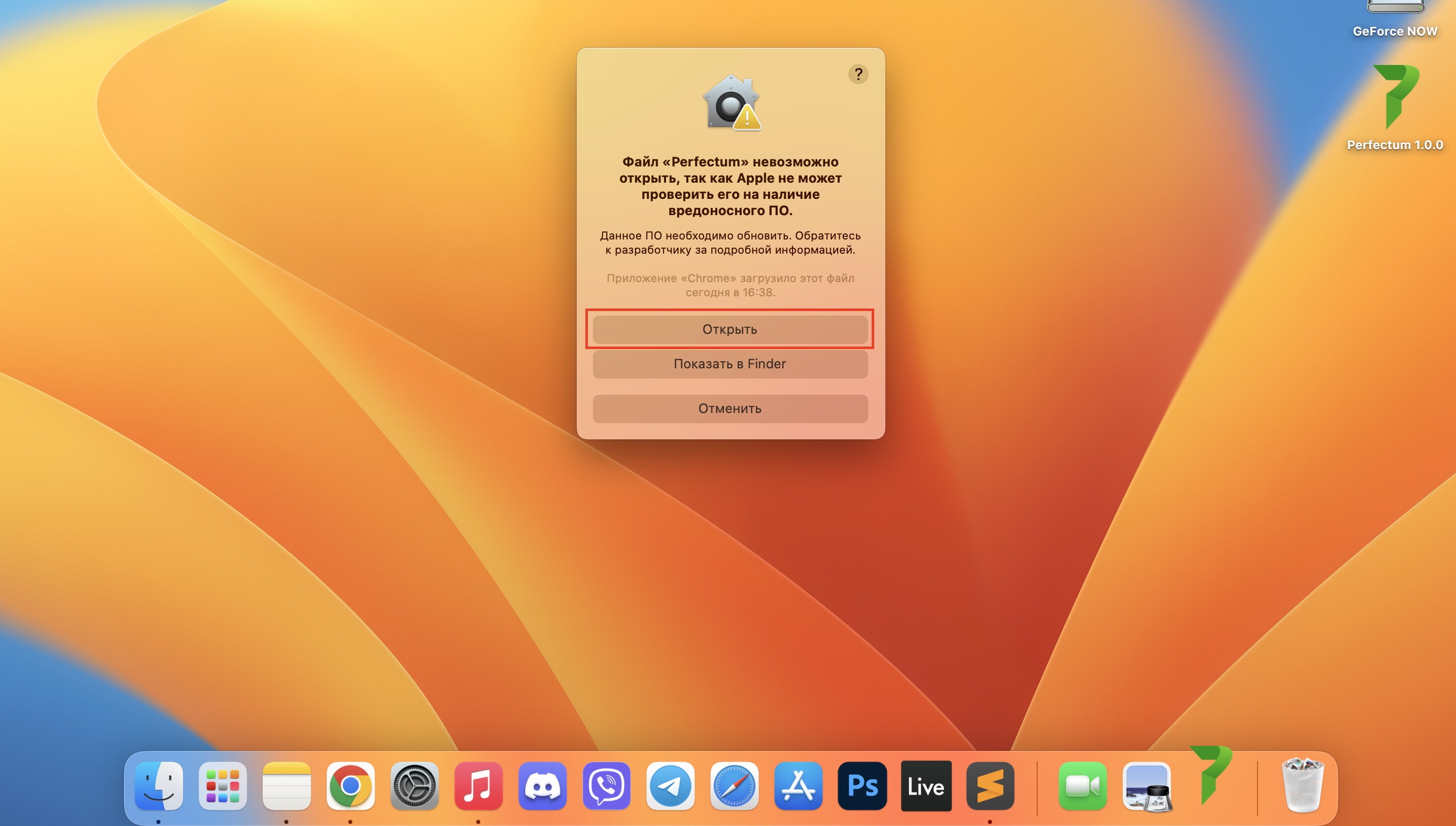 Якщо при відкритті програми відкрилося вікно помилки, необхідно його закрити після чого ярлик програми Perfectum залишиться в Dock, натисніть на нього правою кнопкою миші та виберіть "Відкрити"