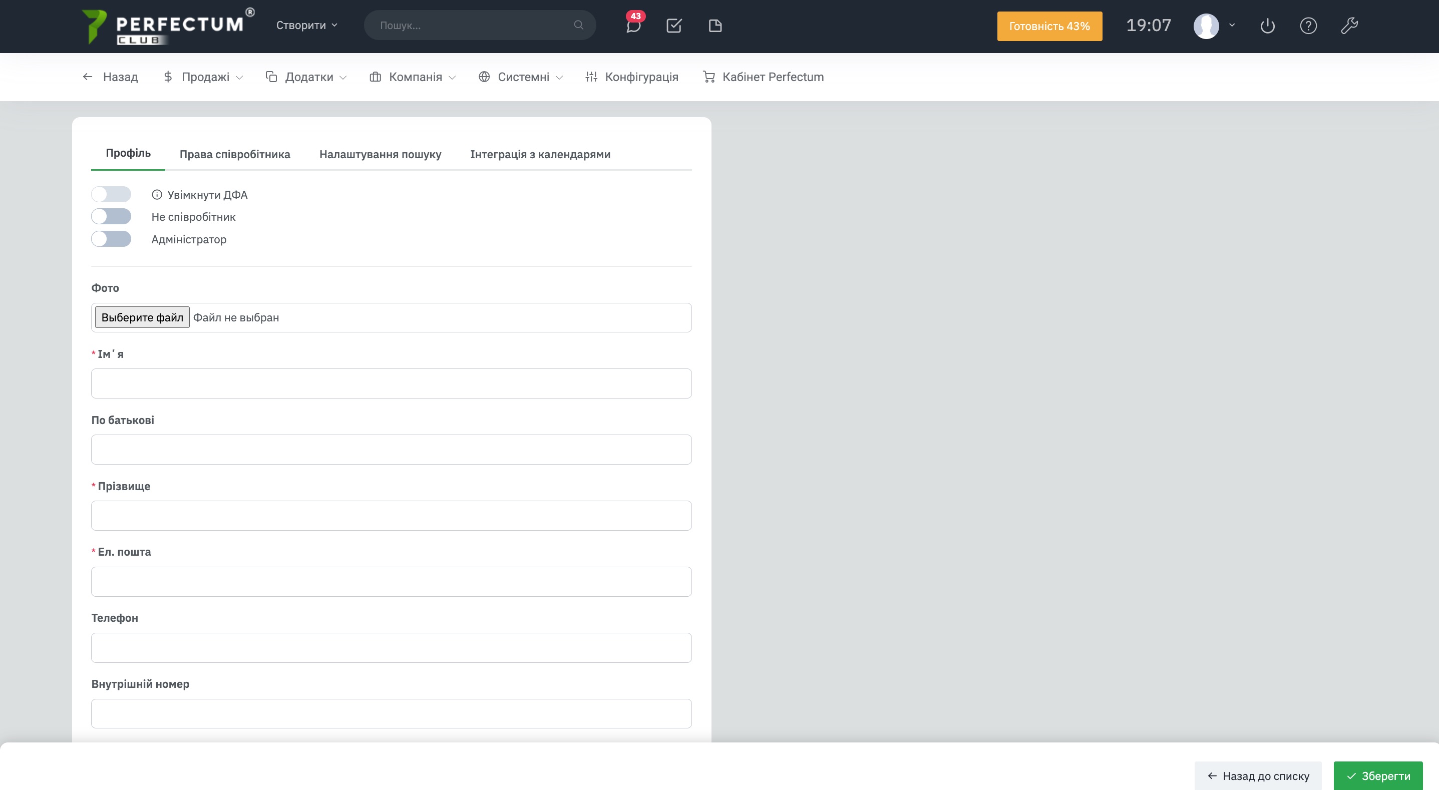 - Не співробітник - ця функція дає можливість створення співробітника з обмеженим доступом до системи. Співробітник зможе авторизуватися в системі, але не зможе бачити весь функціонал системи, а отже, ним користуватися