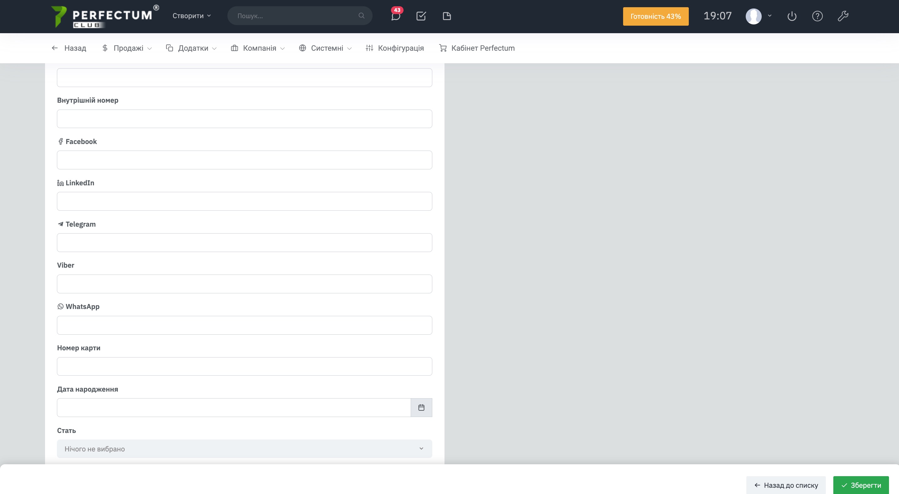 При створенні співробітника відкривається його картка, де можна заповнити таку інформацію: