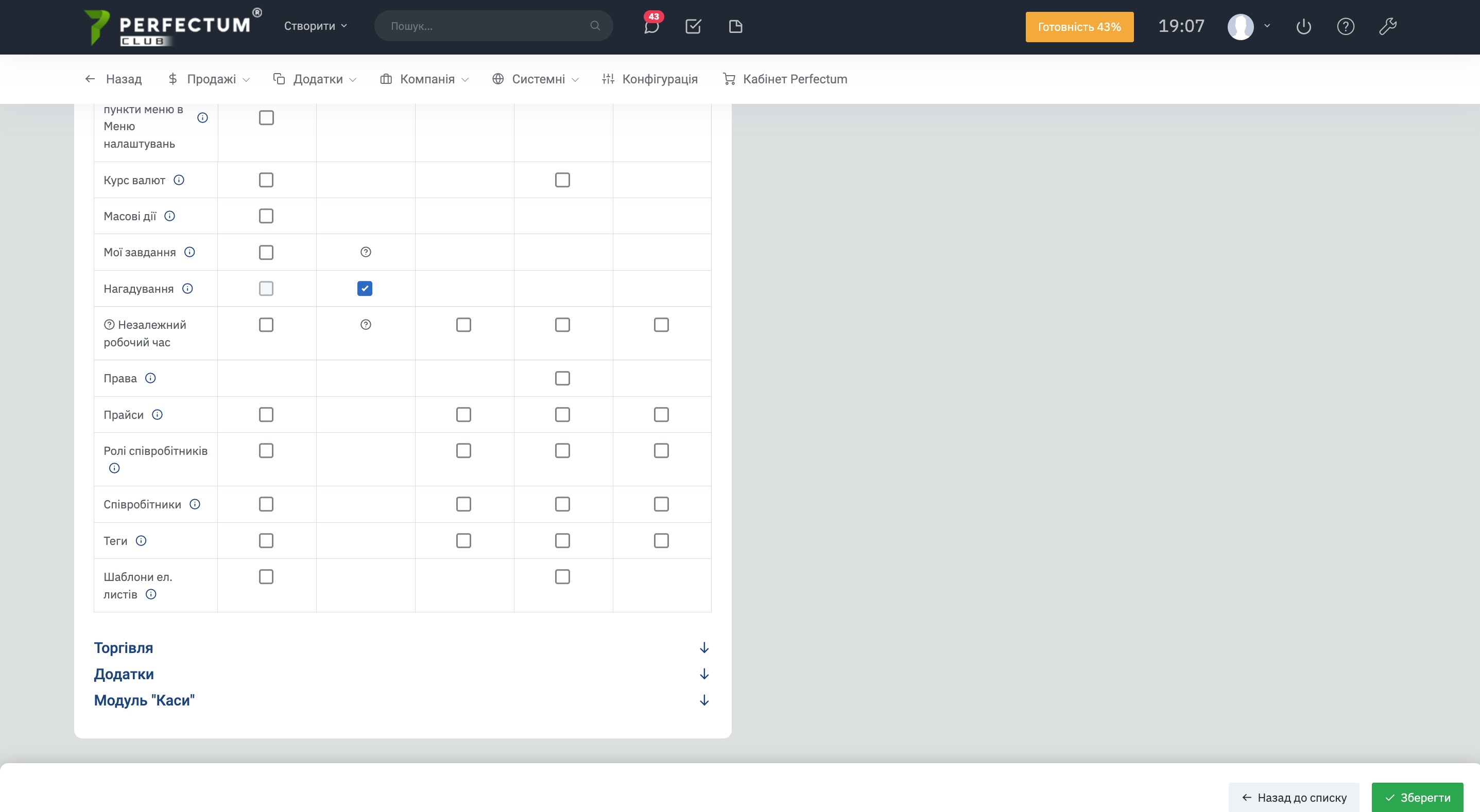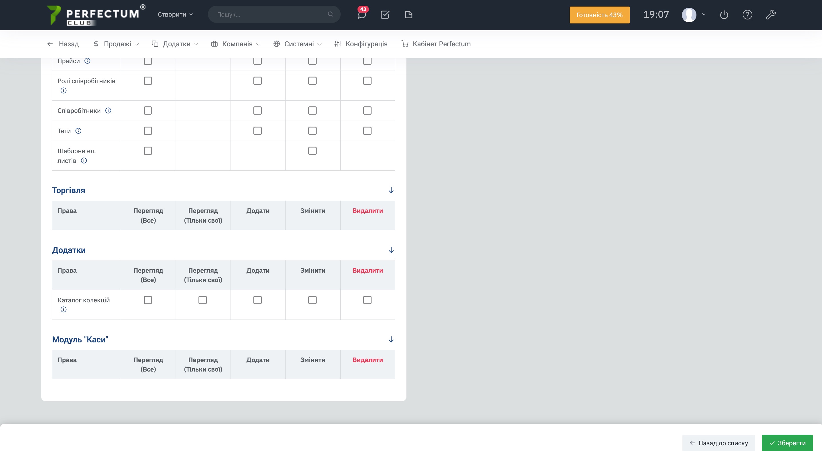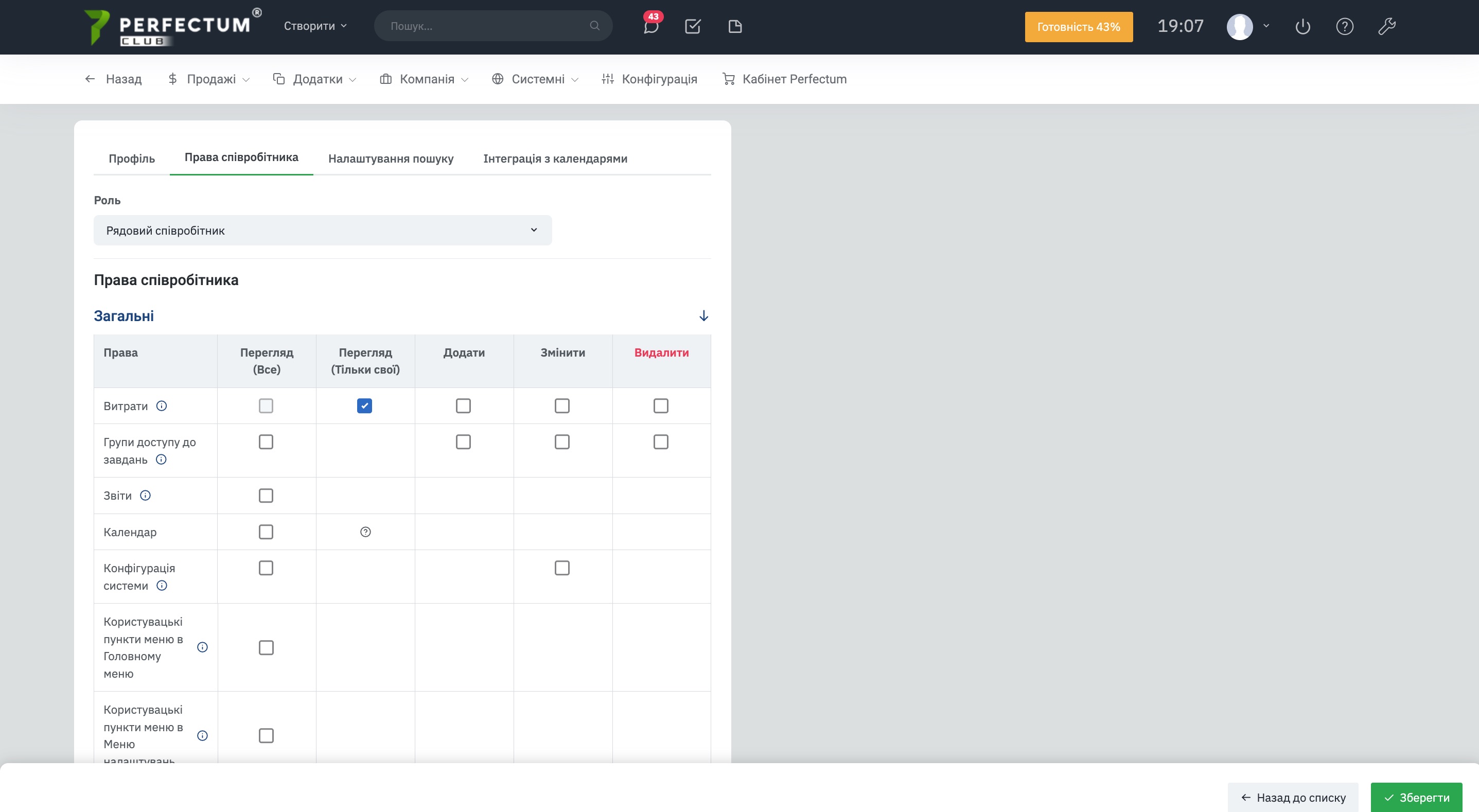 Права співробітника - ви надаєте доступ співробітнику до різних модулів/розділів системи. Ви можете вибрати одну зі створених ролей, щоб застосувати до працівника права цієї ролі. Для адміністраторів не потрібно налаштовувати права доступу.