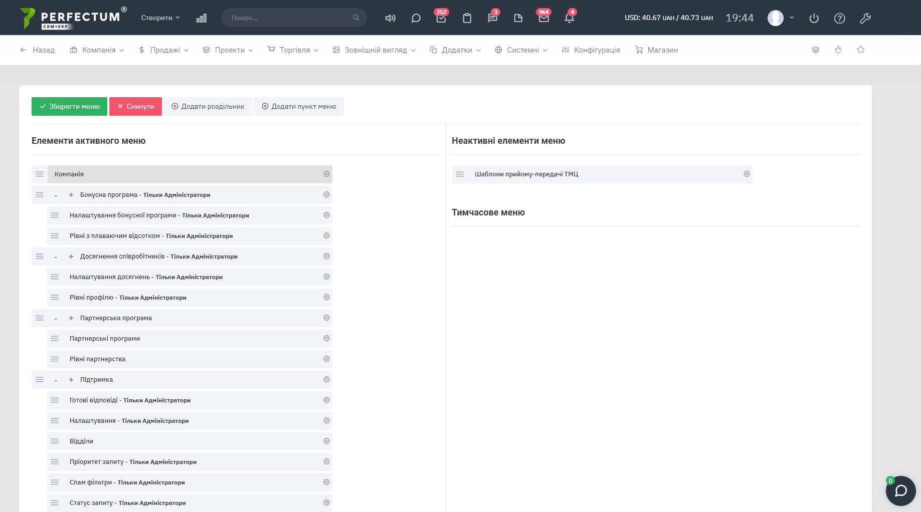Цей розділ дозволяє налаштувати меню розділу "Налаштування". Для налаштування перейдіть: "Налаштування -> Системні -> Налаштування меню -> Меню налаштувань".