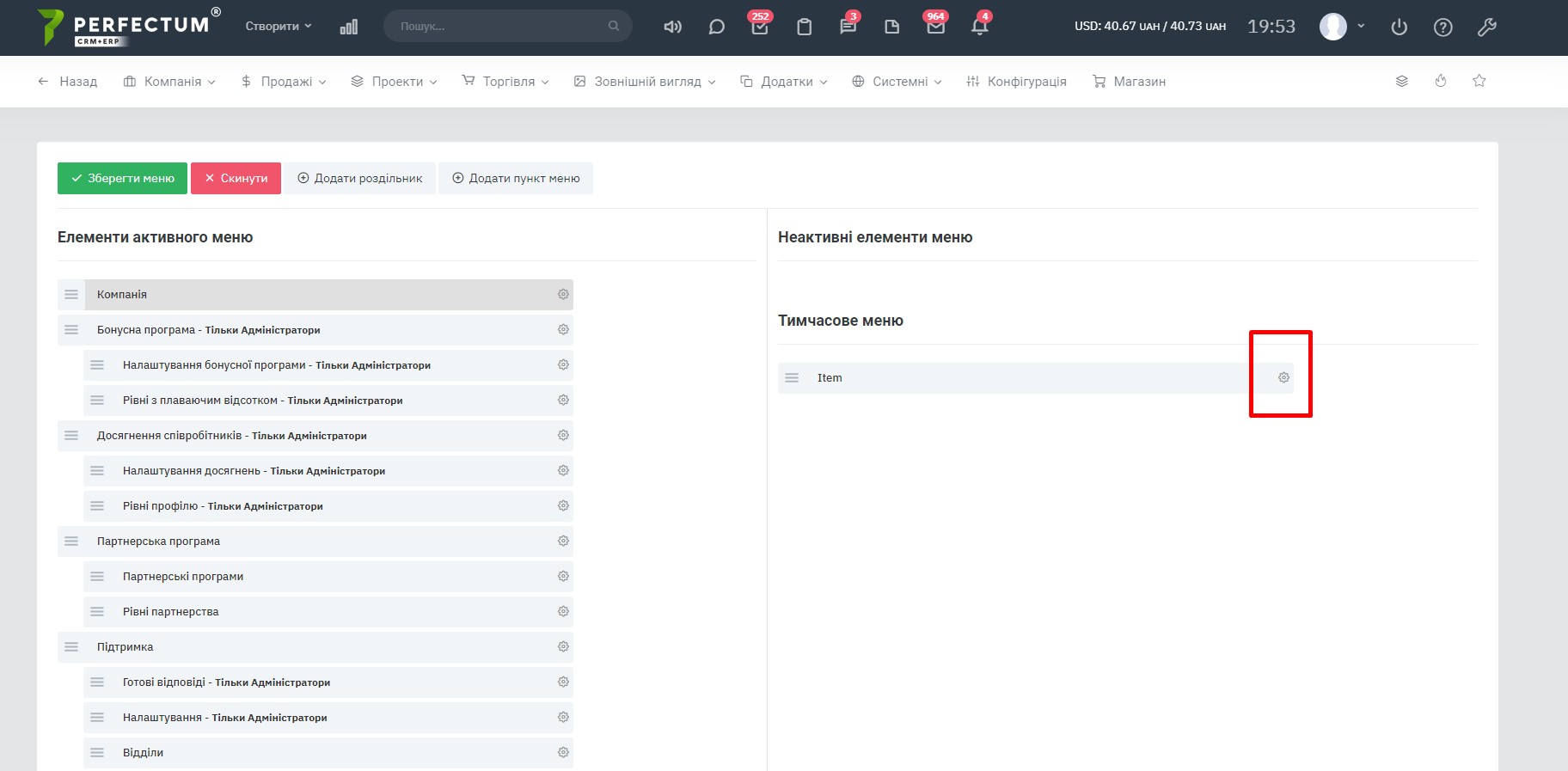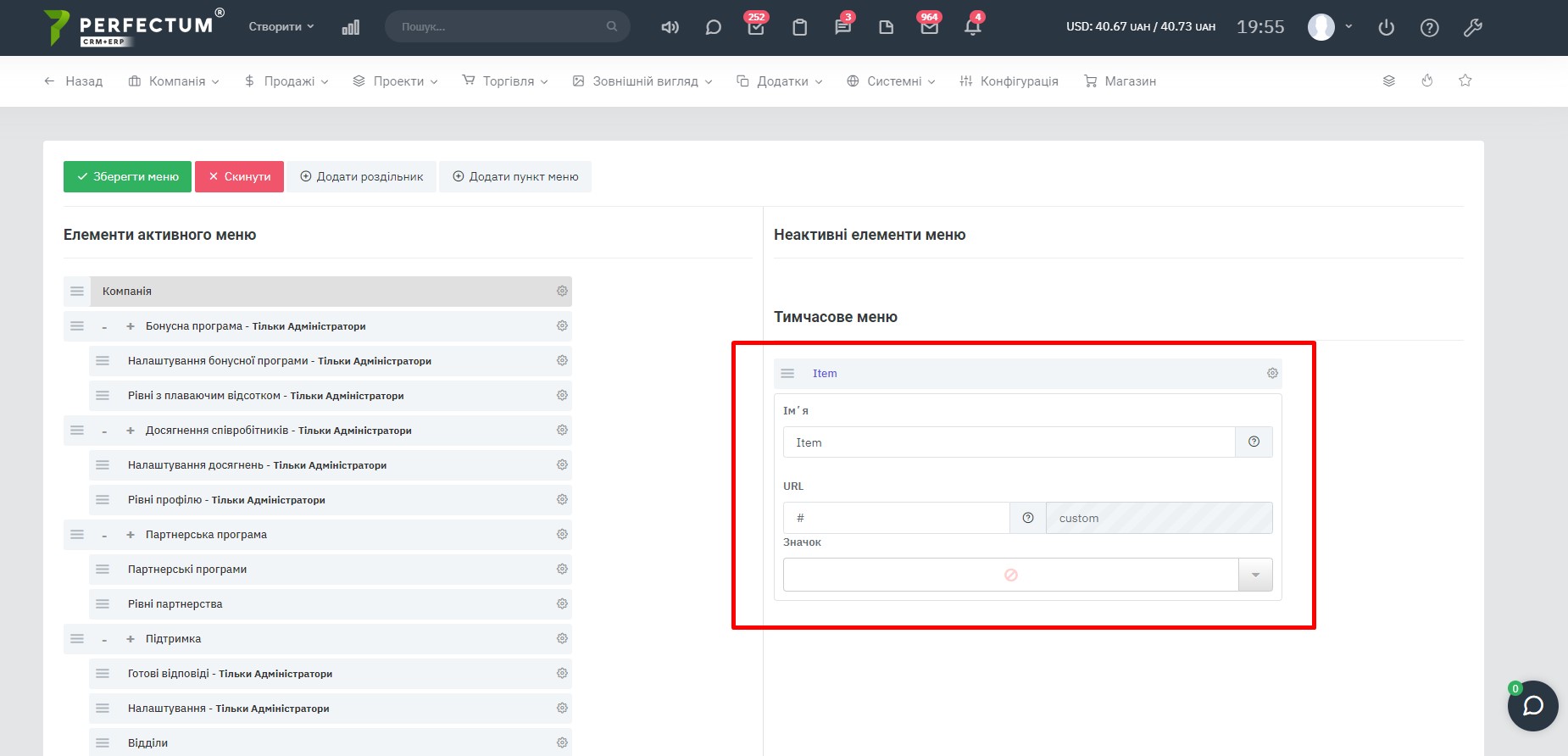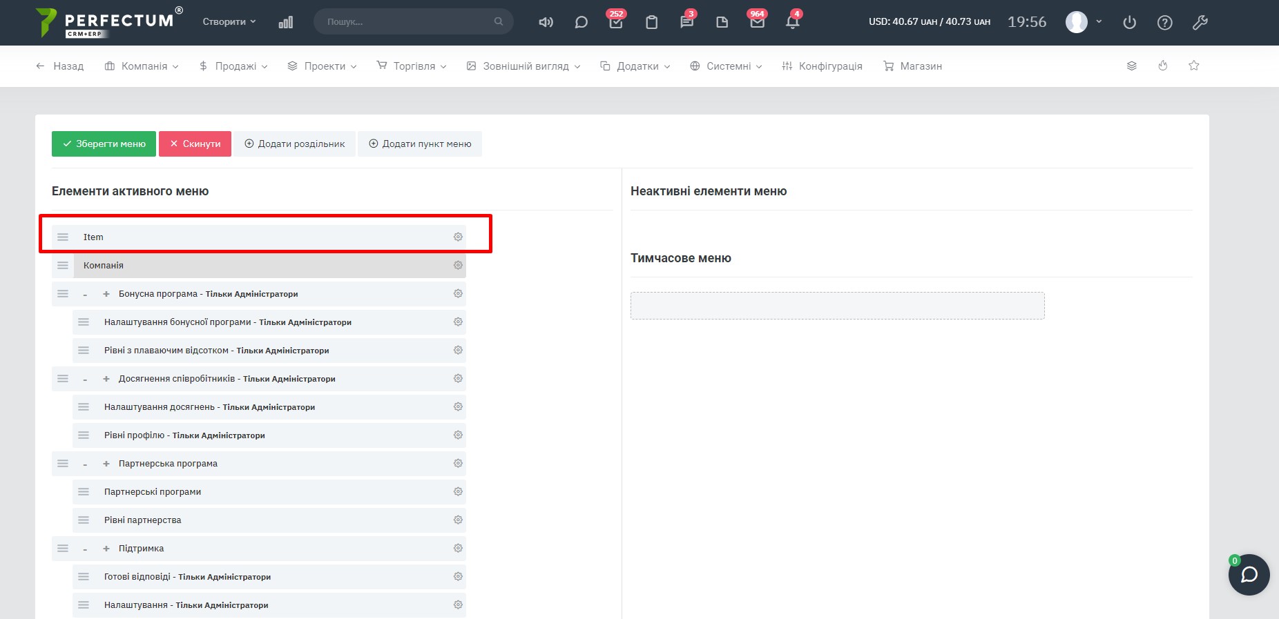 2. У "Неактивних елементах меню" у "Тимчасовому меню" з'явиться пункт "Item". Його можна редагувати, клацнувши на іконку в правій області пункту;
