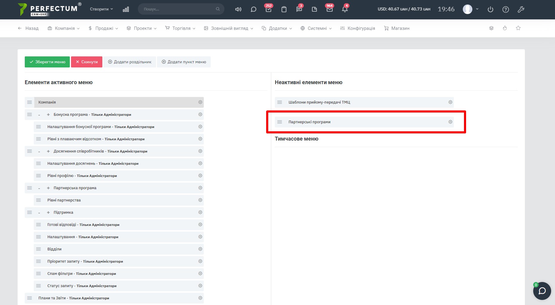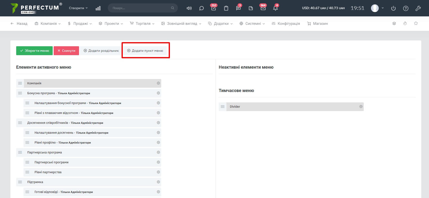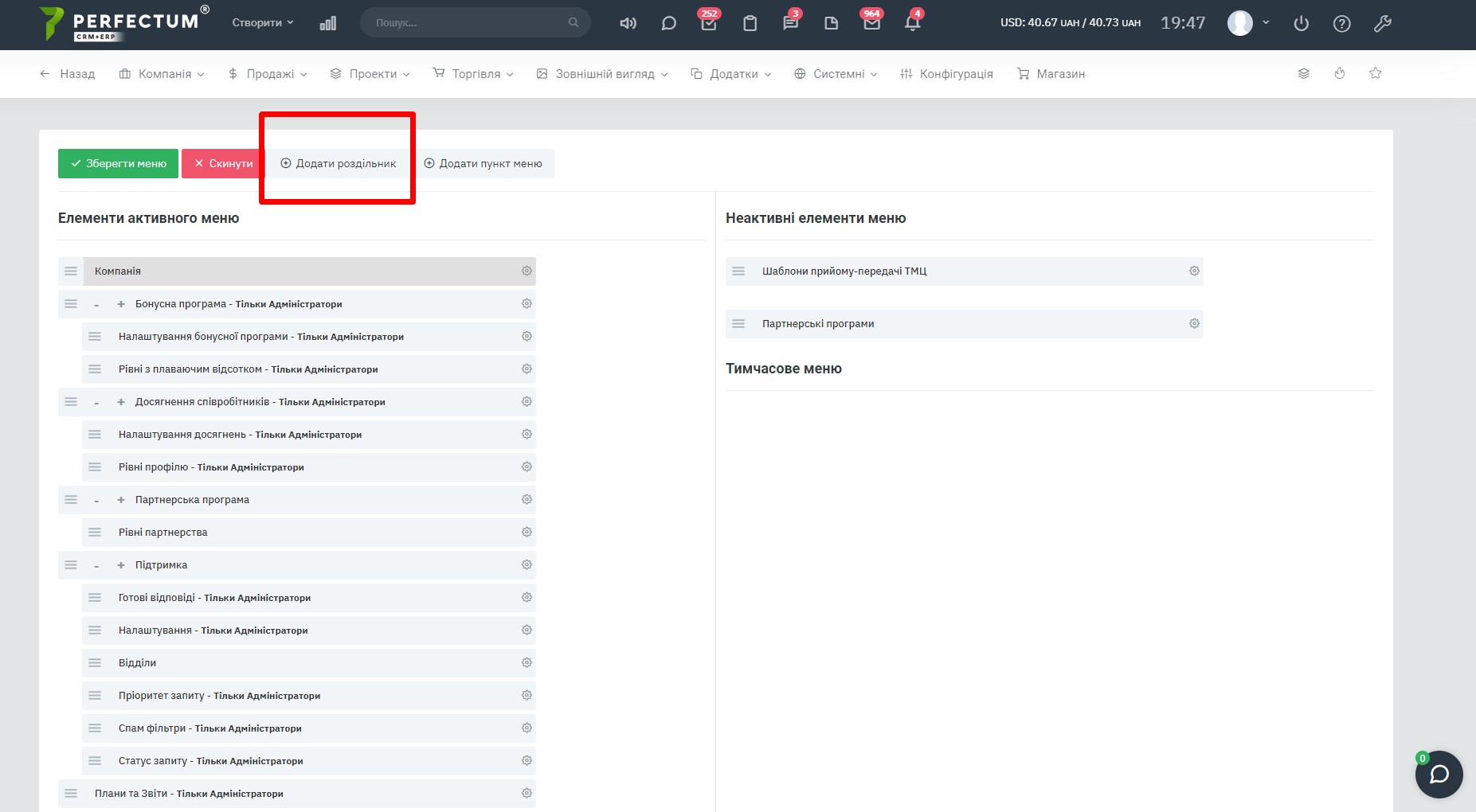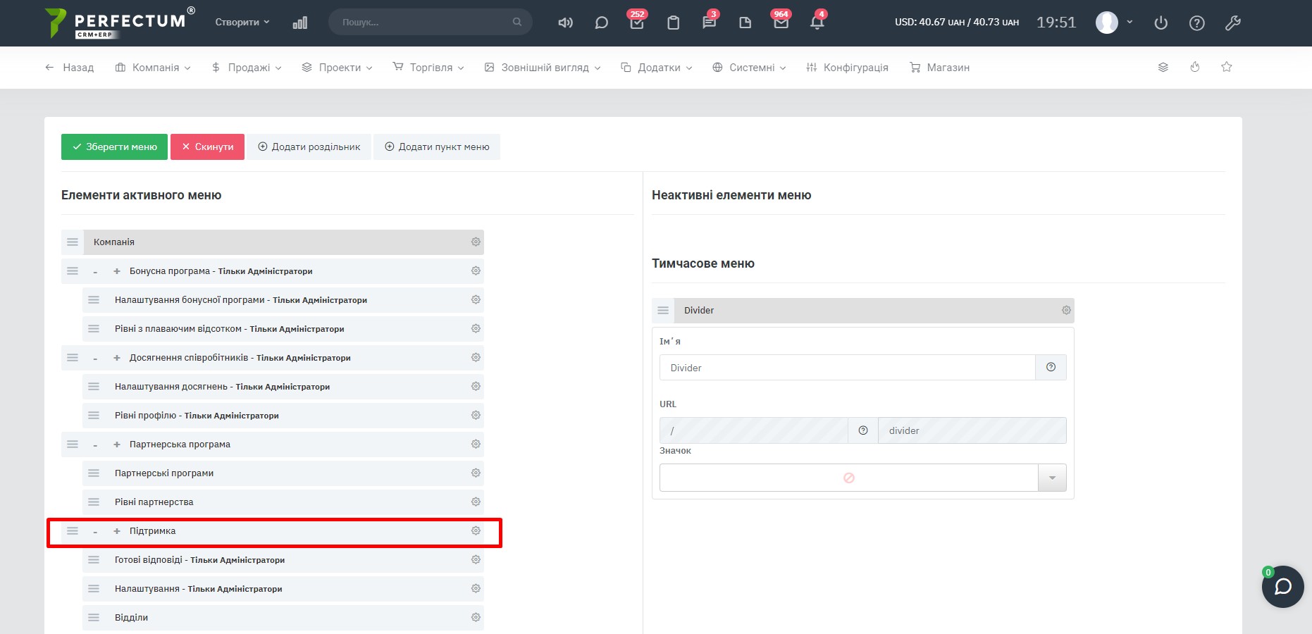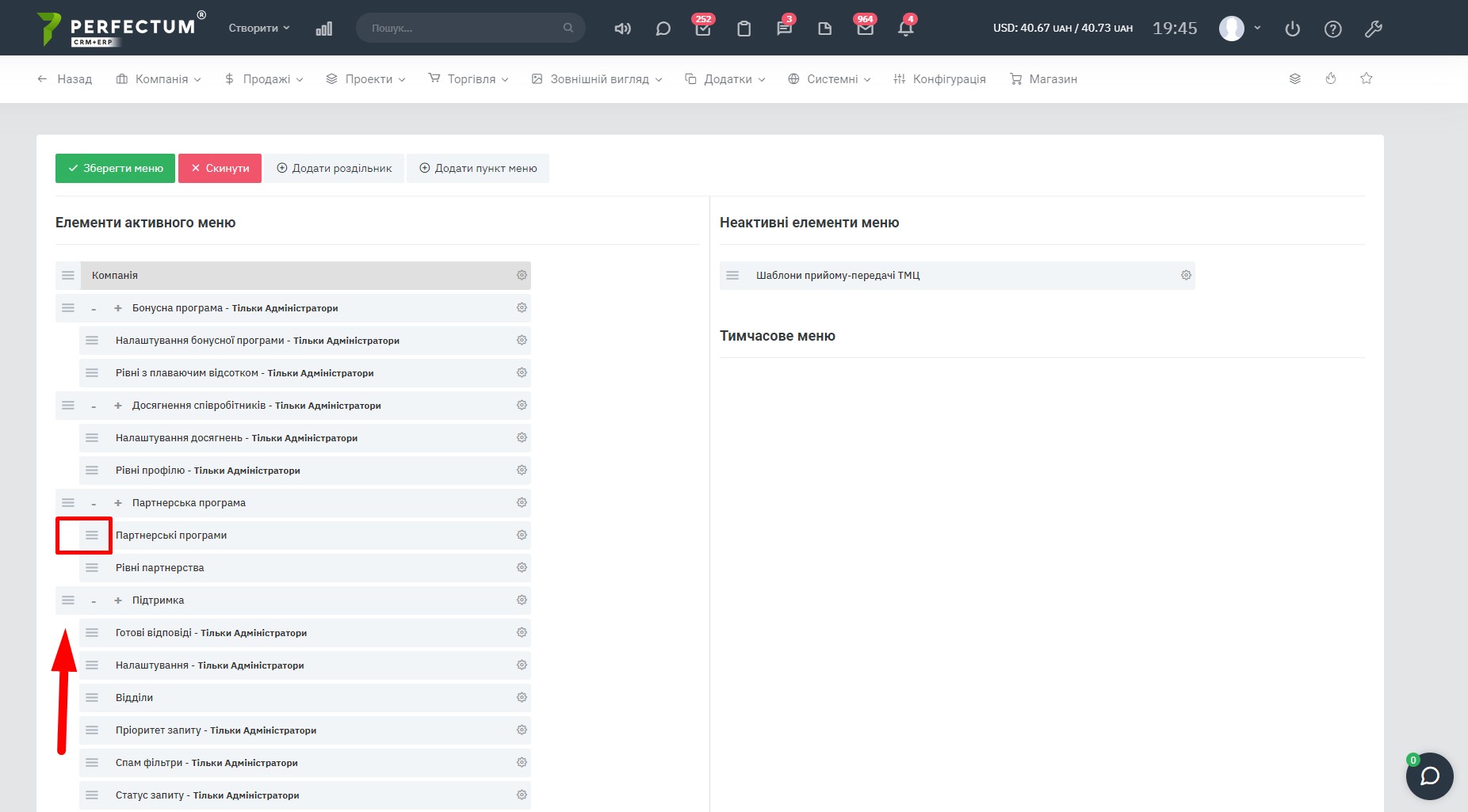 4. Перетягніть роздільник з тимчасового меню до активного меню