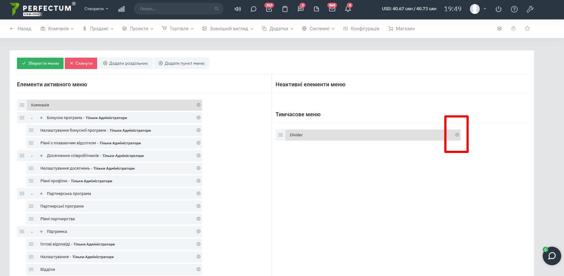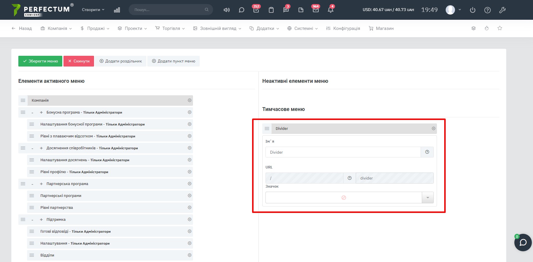 2. У "Неактивних елементах меню" у "Тимчасовому меню" з'явиться пункт "Divider". Його можна редагувати, клацнувши на іконку в правій області пункту.