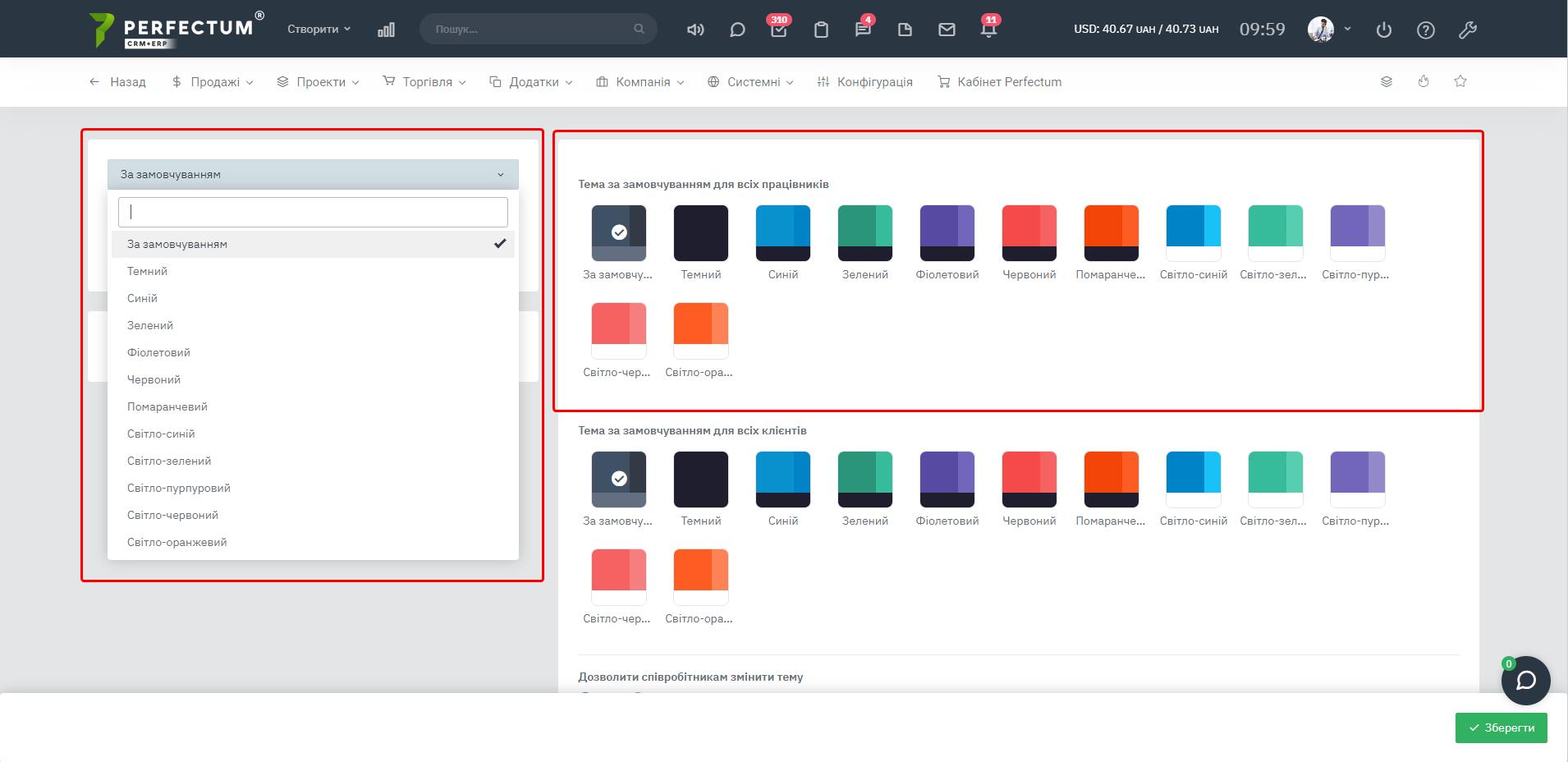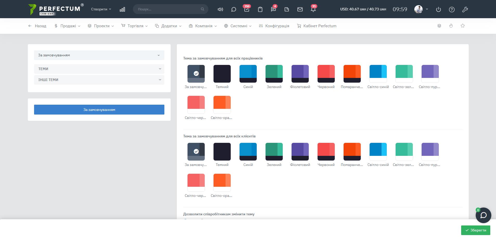- Шаблони тем - для вибору попередньо встановленої кольорової схеми системи для всіх співробітників чи всіх клієнтів