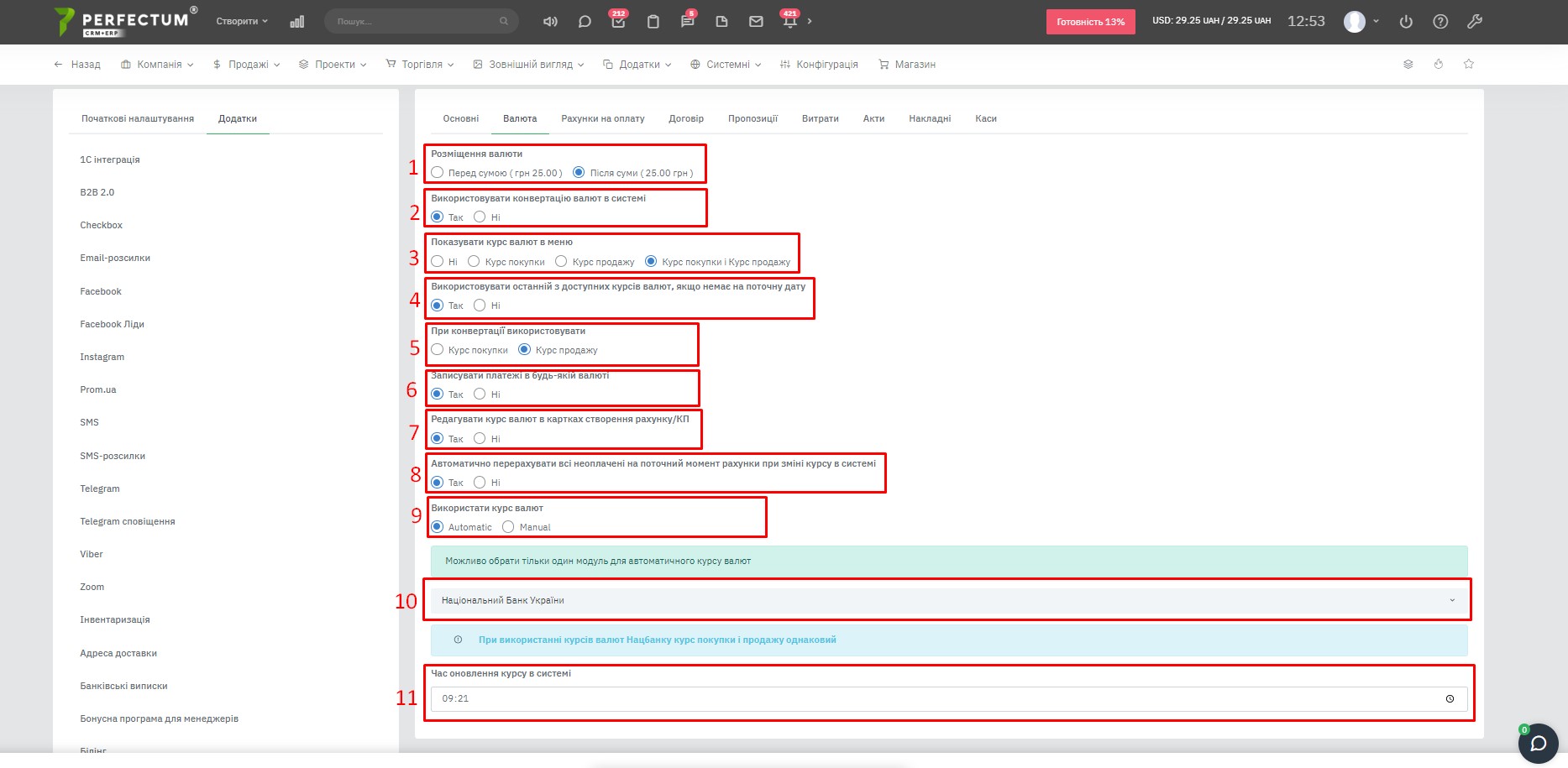 - використовувати конвертацію валют у системі - Так/Ні. Поля нижче доступні, якщо увімкнено конвертацію валют