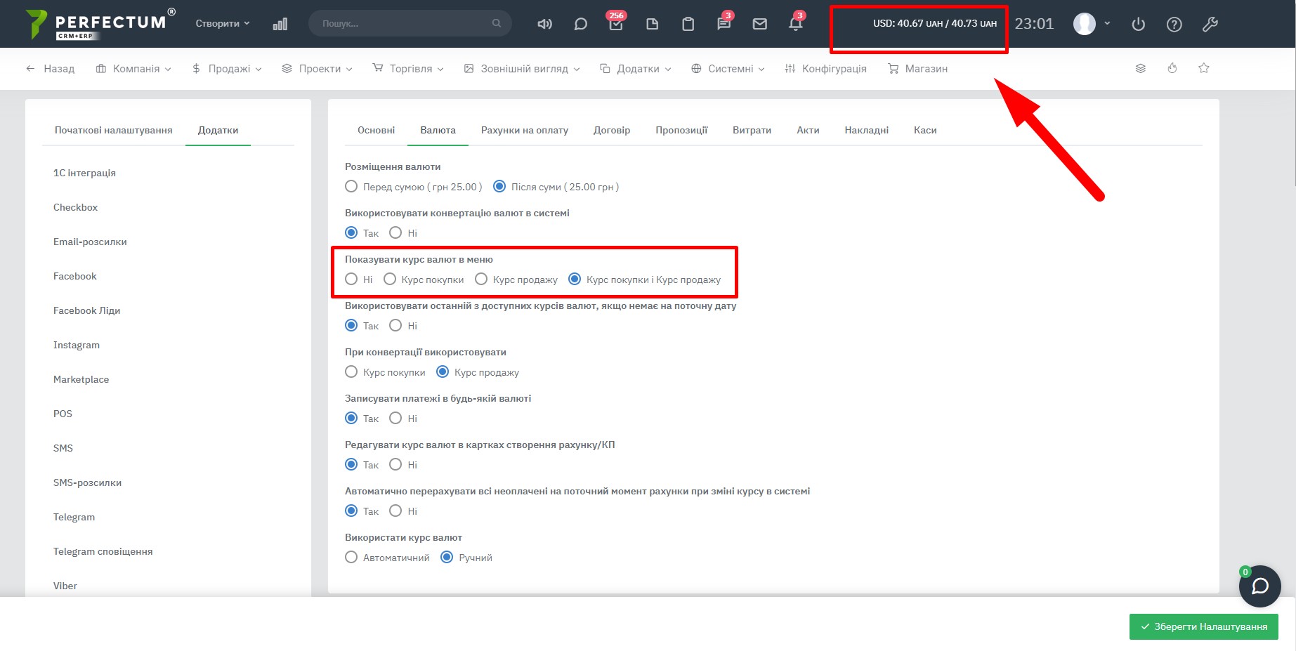 Для налаштування валют перейдіть в "Налаштування -> Продажі -> Фінанси -> Валюта", на сторінці доступно: