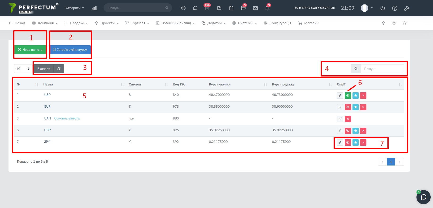 - кнопки "Показати/Приховати у верхньому меню"; "Визначити як основна валюта"; "Видалити" - для видалення валюти