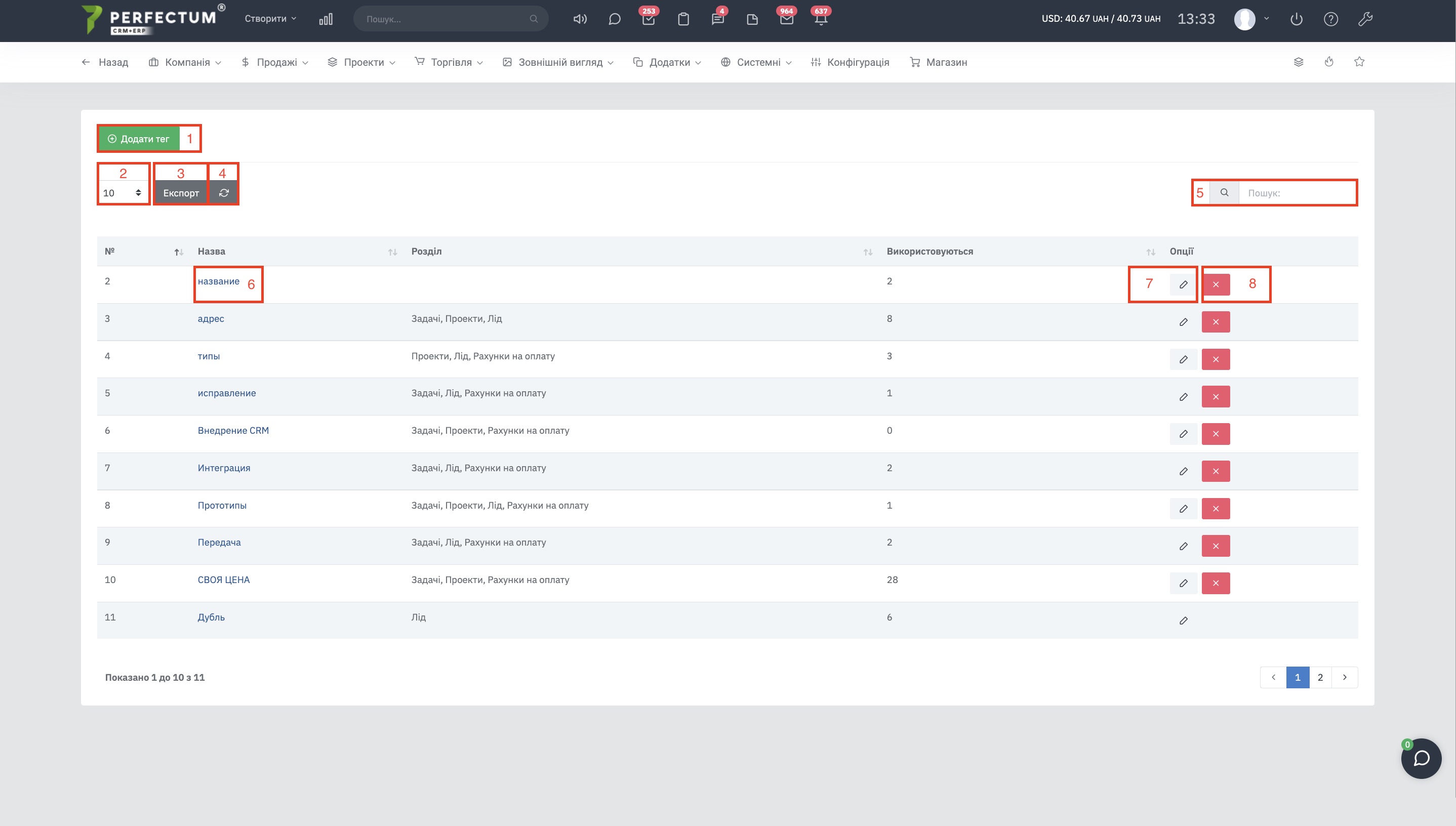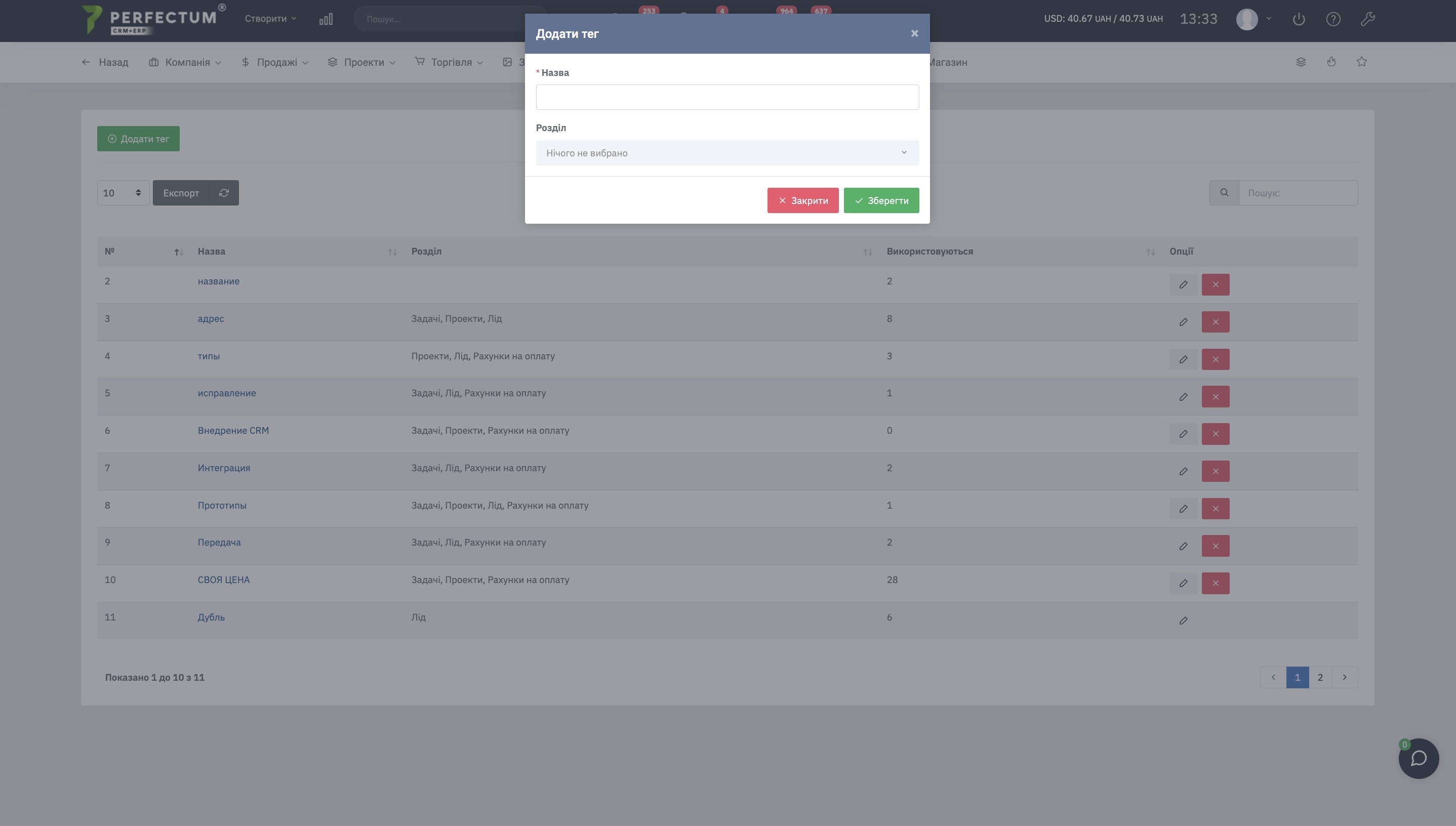 Доступні розділи системи для використання тегів: Завдання, Проєкти, Ліди, Рахунки на оплату, Пропозиції, Підтримка, Договори, Замовлення, Інвентаризація.