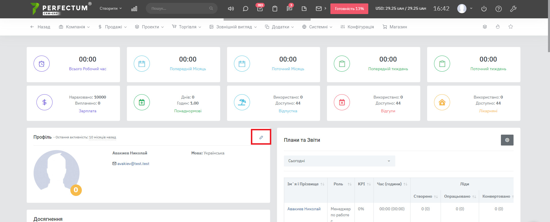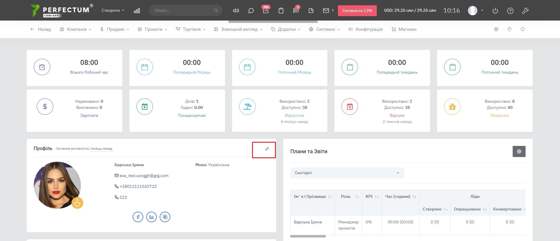 Для того щоб потрапити в меню редагування профілю співробітника, перейдіть: -> Налаштування -> Компанія -> Співробітники -> Карта співробітника -> Іконка редагувати.