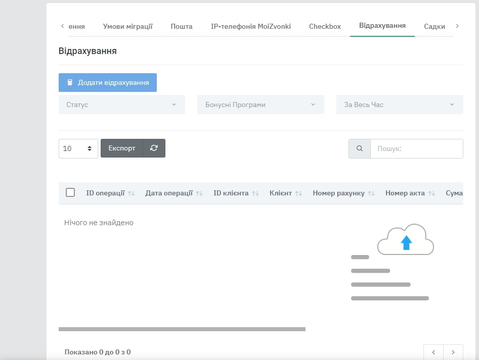 У цій вкладці ви можете налаштовувати відрахування співробітника, створювати нові, переглядати та змінювати статус відрахувань, вибирати бонусну програму та фільтрувати відрахування за періодом і датою.