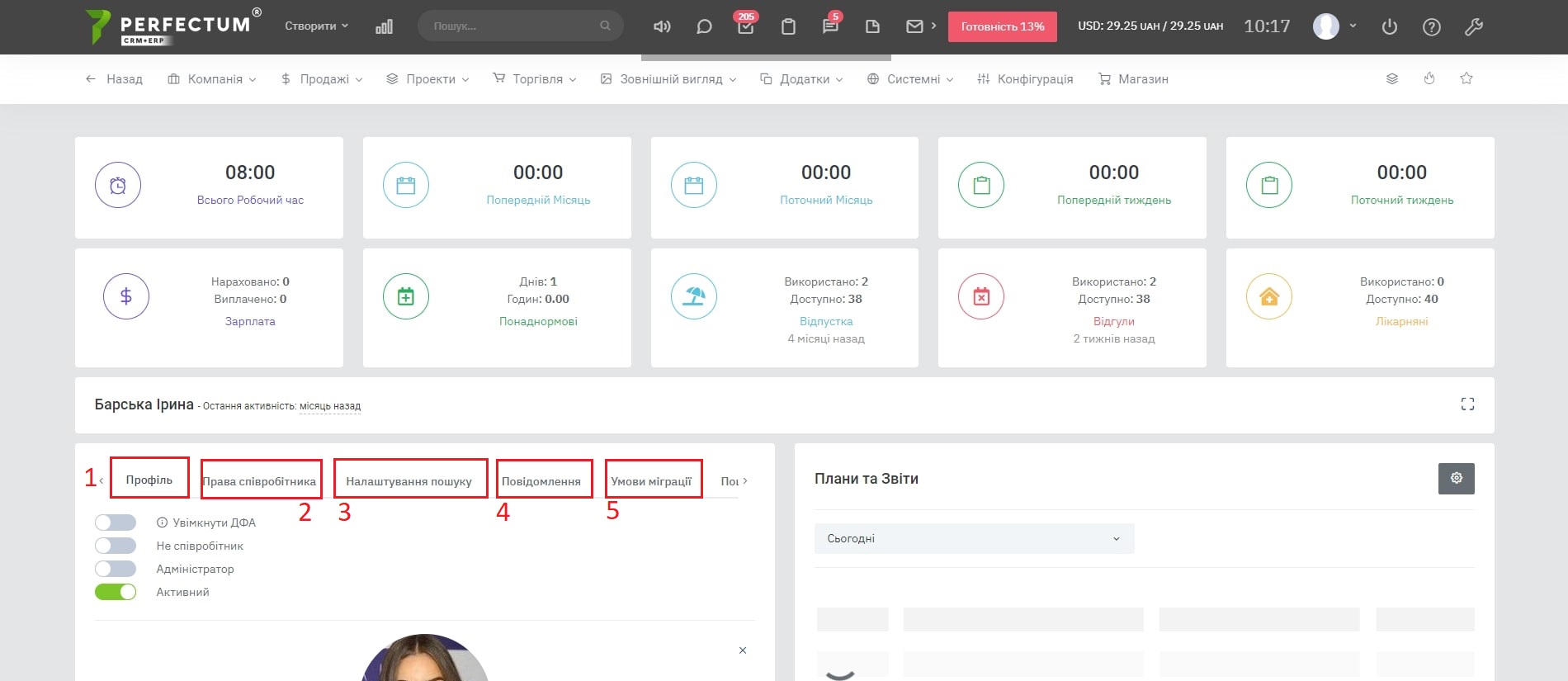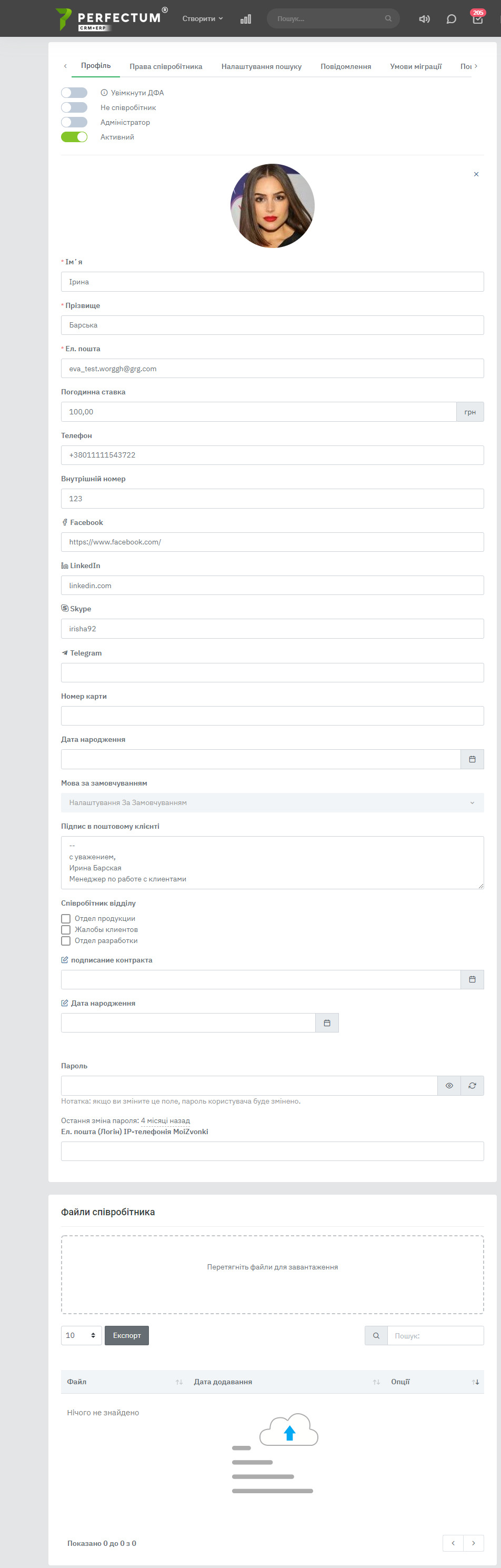 2. Змінити ім'я, прізвище, електронну пошту, погодинну ставку співробітника, мобільний та внутрішній номер телефону, посилання на фейсбук, телеграм, скайп співробітника, номер платіжної картки, дату народження співробітника, підпис співробітника у поштовому клієнті, вибрати відділ для співробітника, підписання контракту та пароль співробітника.