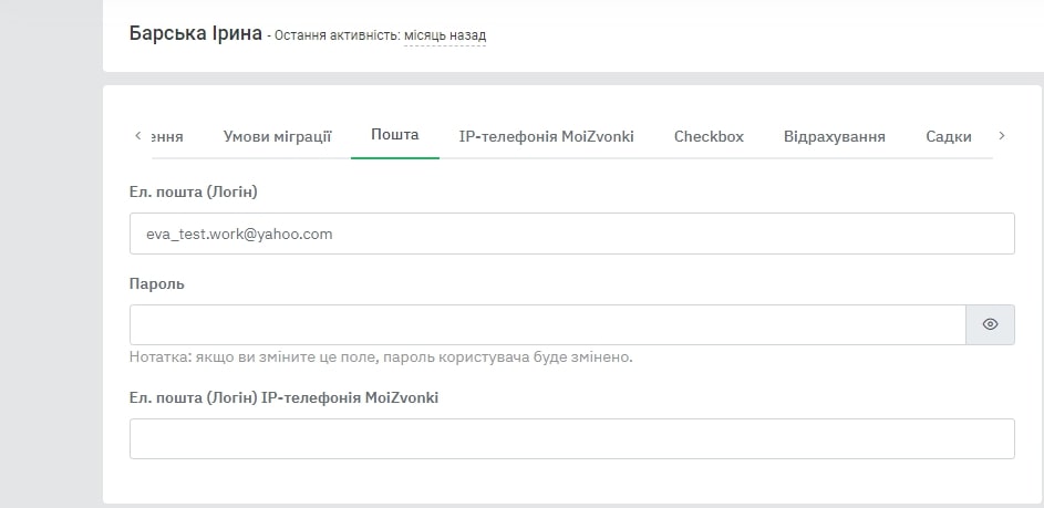У цій вкладці можна редагувати пошту та пароль співробітника.