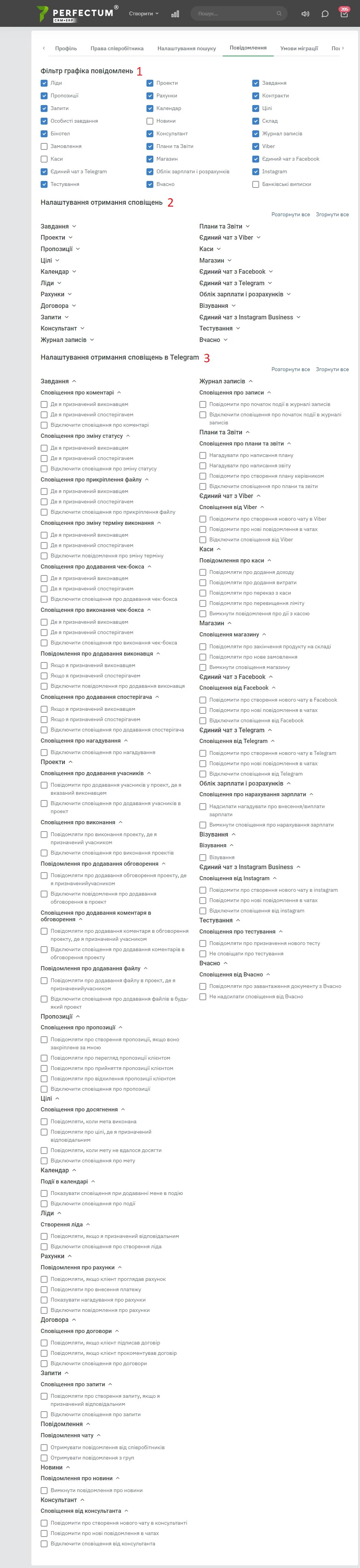 Налаштування отримання повідомлень - вкладка в якій можна налаштувати за якими критеріями надходитиме повідомлення співробітнику.