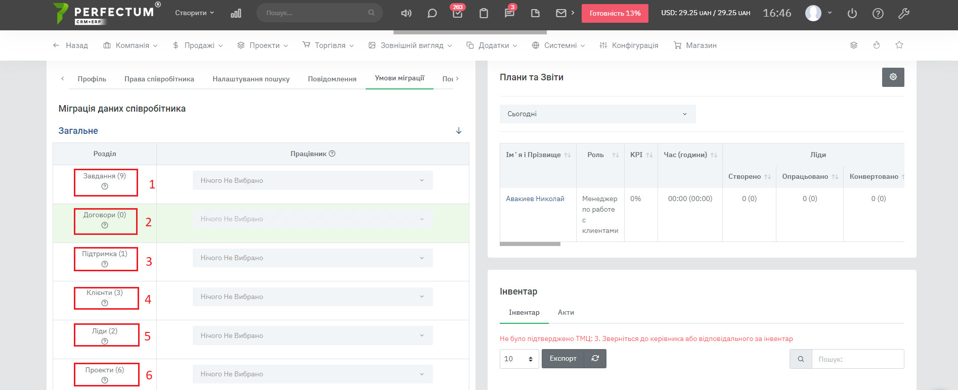 Ця функція необхідна для управління міграцією даних співробітників. Є можливість переносити завдання та дані з одного співробітника на іншого. Наприклад, у разі звільнення.