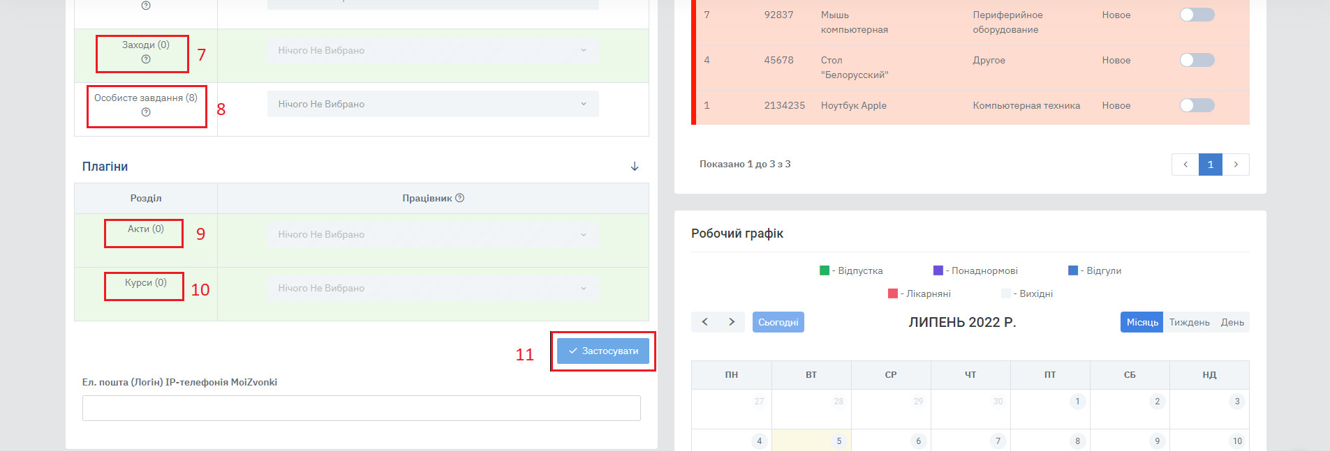7. Заходи - зміна закріпленого співробітника за всіма подіями в календарі та ненаправленим повідомленням щодо них;