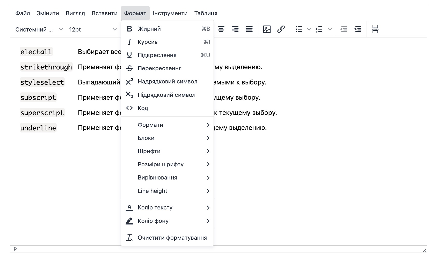 - Очистити форматування - очищає все форматування тексту.