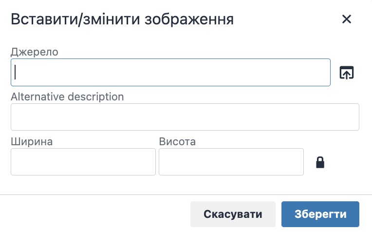 При вставці/редагуванні зображення необхідно вказати: