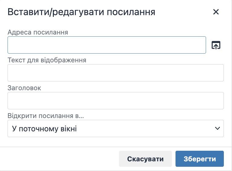 При вставці/редагуванні посилання необхідно вказати: