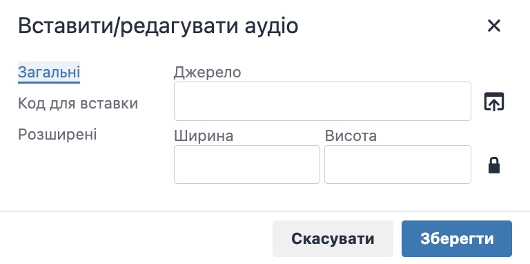 - Загальні - необхідно вставити посилання на медіафайл, вказати висоту та ширину.
