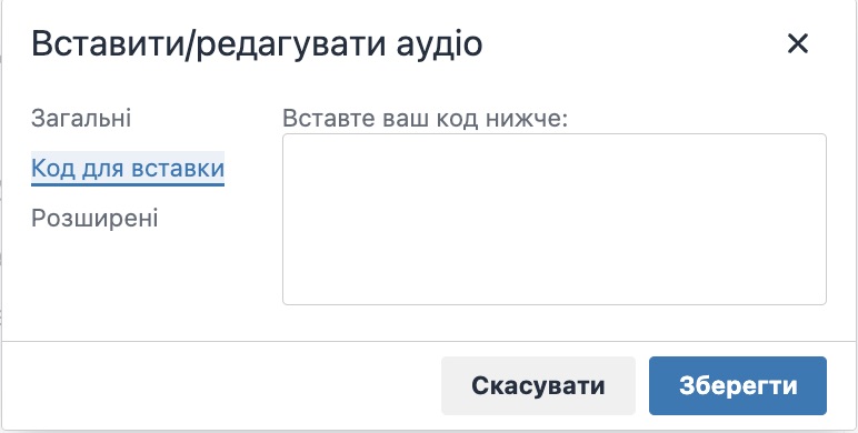 - Код для вставки - необхідно вставити код, в якому вказані всі необхідні параметри для відображення медіафайлу.