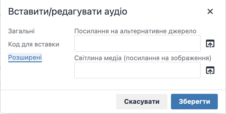 - Розширені – дозволяє вставити посилання на альтернативне джерело та зображення.