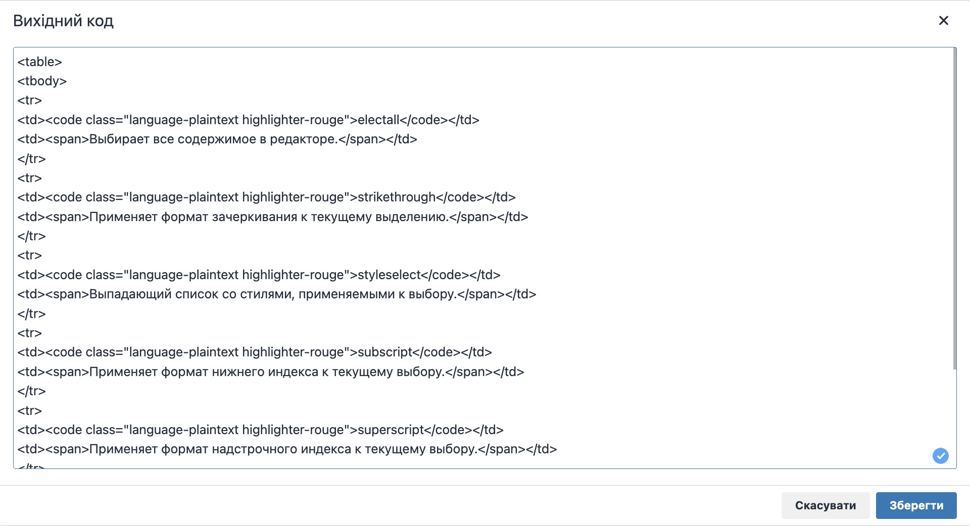- Вихідний код – після натискання відкривається вікно з вихідним кодом документа. Цей код можна скопіювати, видалити, редагувати, а також вставити вже готовий шаблон у вигляді коду.