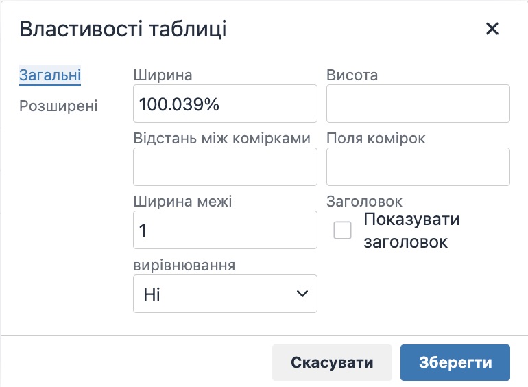 - Таблиця – дозволяє вставити таблицю за заданими параметрами.