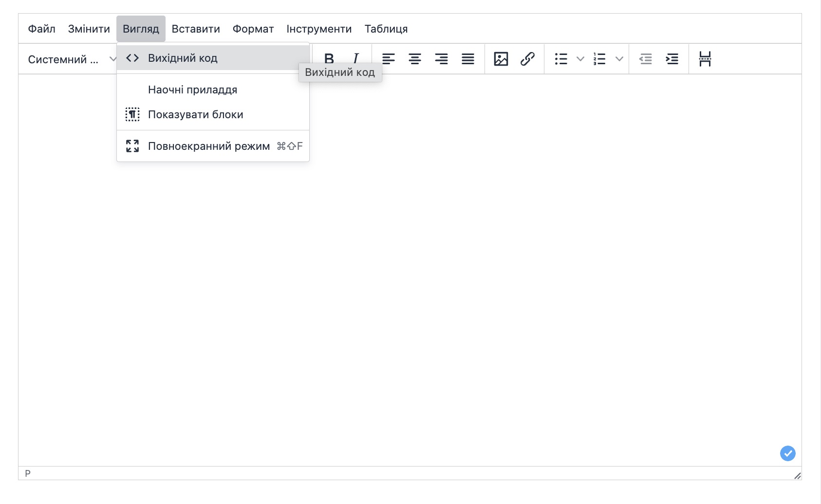 Розділ меню "Інструменти". Дозволяє відобразити вихідний код документа.