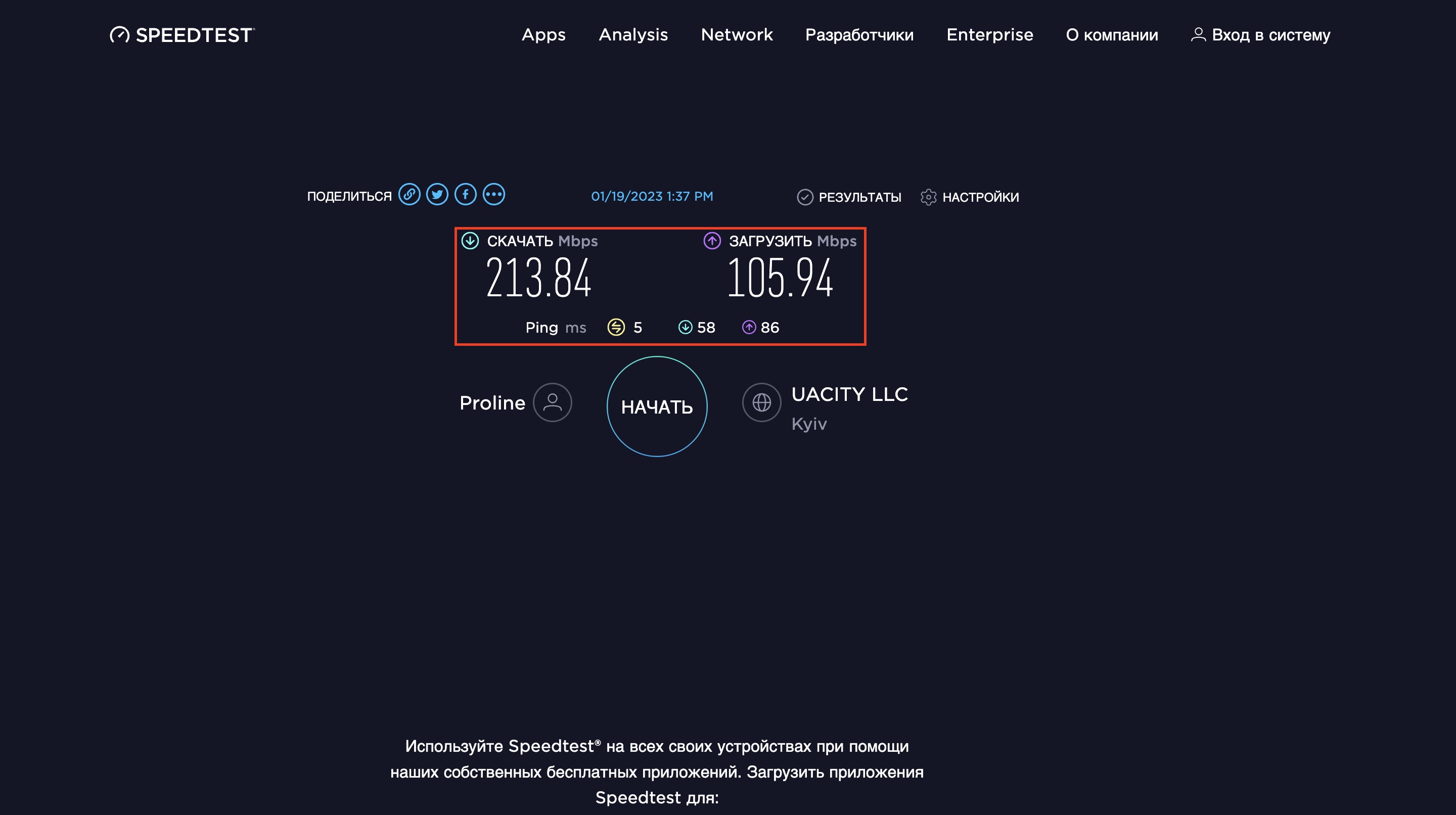 Проаналізувати результати, залежно від Провайдера та підключеного тарифу, швидкість інтернету різна, середня швидкість інтернету при якій комфортно працювати від 20 Мбіт/с.