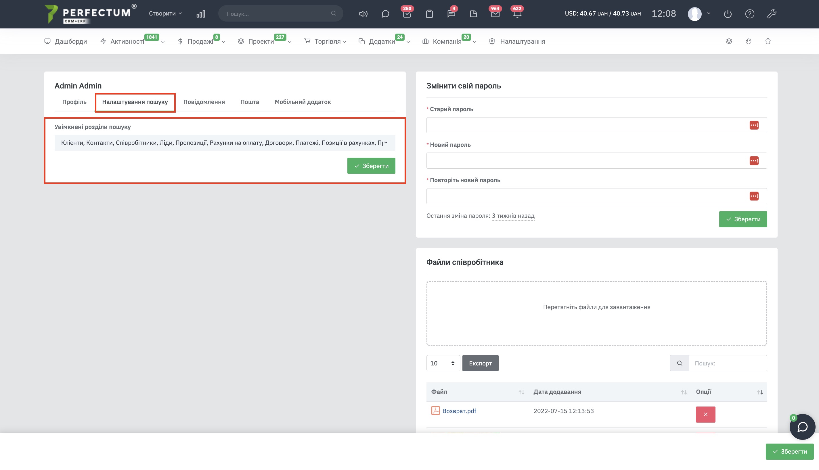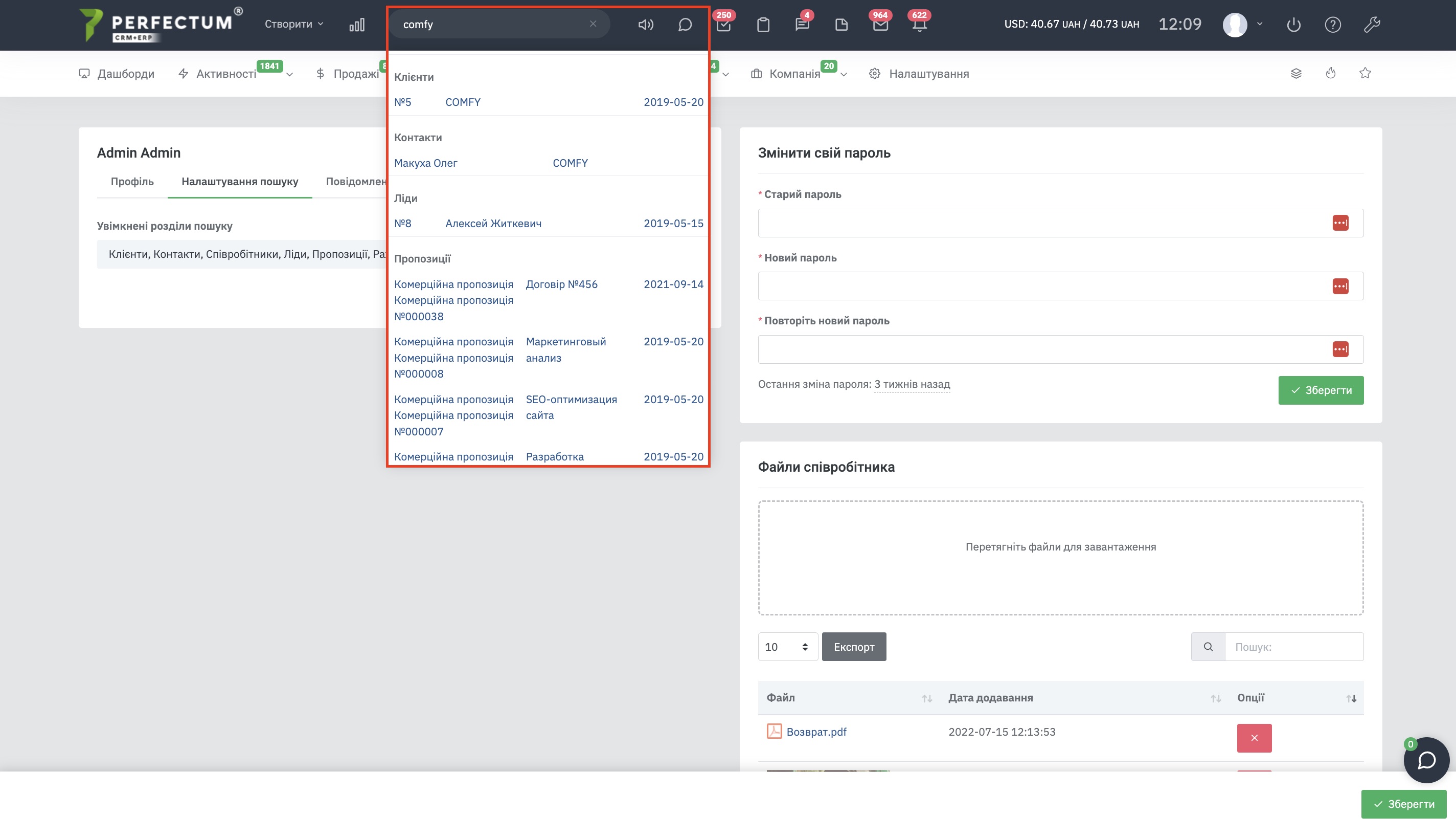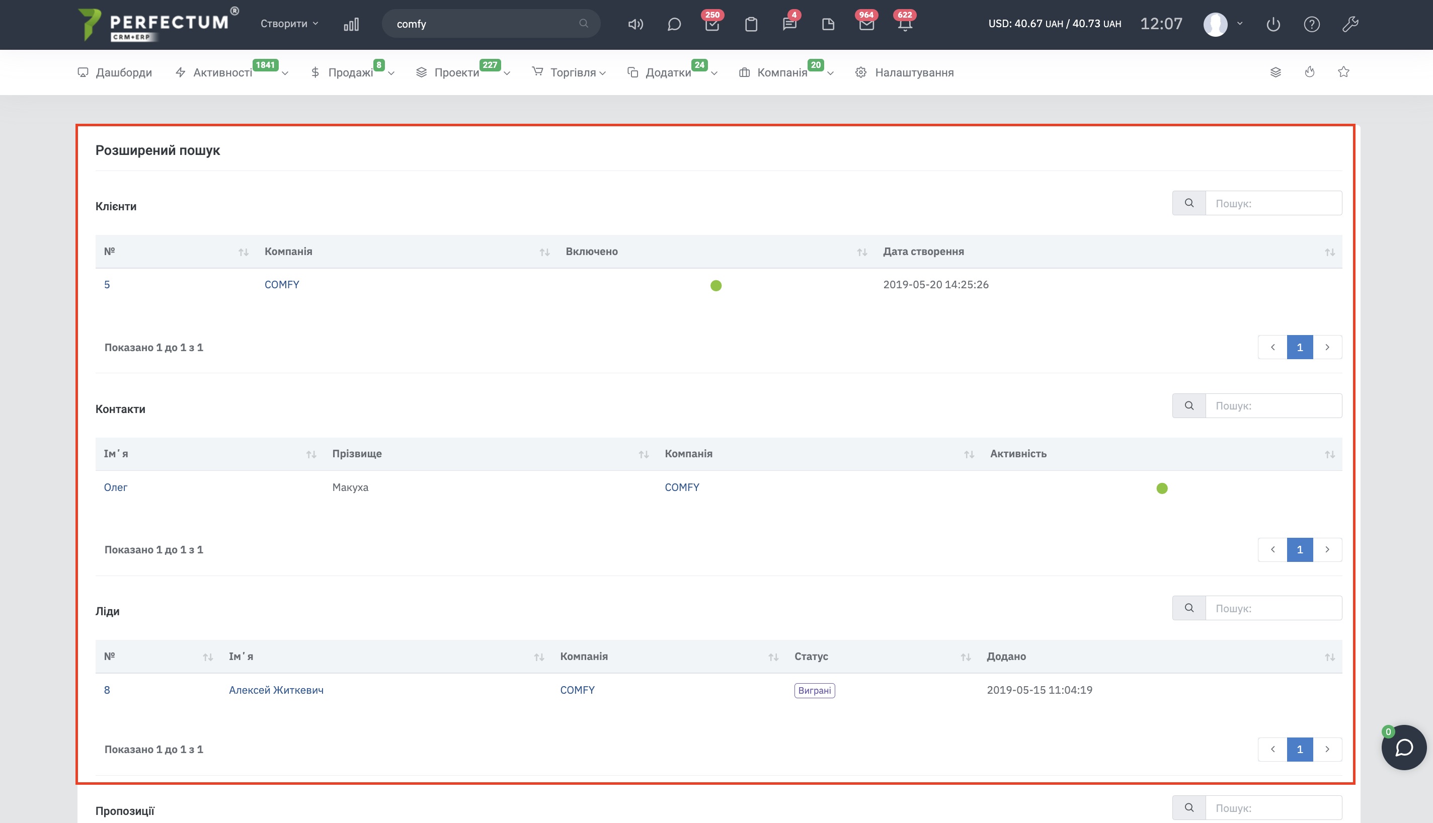 У Perfectum CRM є можливість розширеного і глобального пошуку. Для розширеного/швидкого пошуку у верхній панелі натисніть на поле "Пошук" введіть потрібний вам запит і натисніть клавішу Enter. Для глобального пошуку введіть два або більше символи, натисніть Enter і оберіть потрібний Вам варіант.