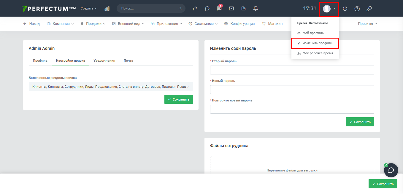 Для налаштування, по яких розділах проводити пошук , натисніть на знак профілю в верхній панелі, і натисніть кнопку "Змінити профіль".