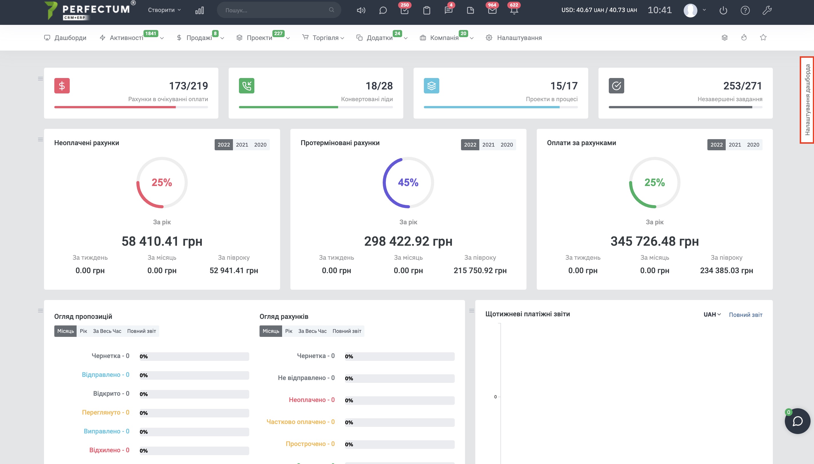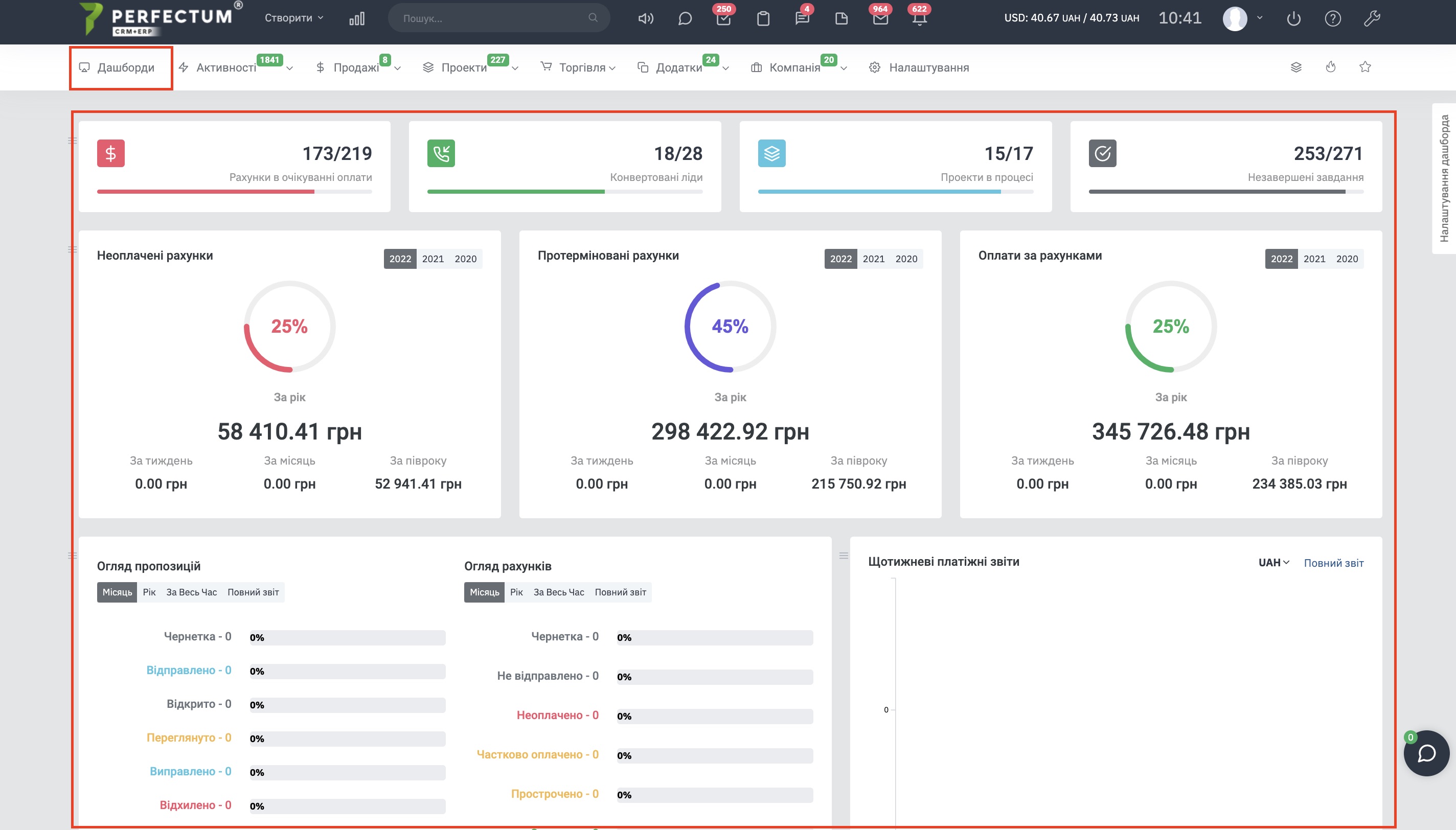 У розділі "Робоча панель" ви можете побачити коротку інформацію з усіх розділів системи, для переходу натисніть на кнопку "Дашборди" у головному меню.