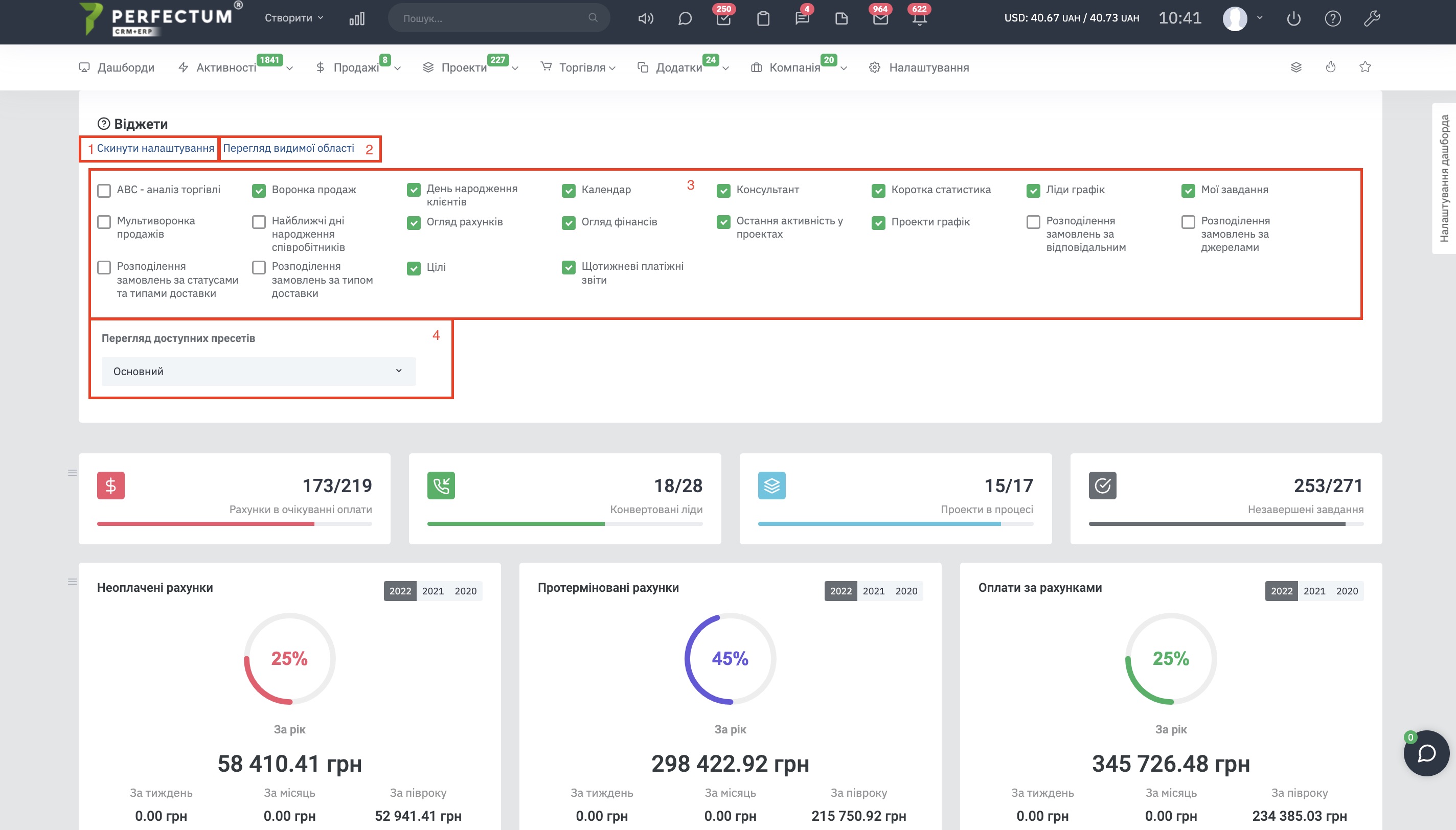 - Виберіть, який дашборд (віджети) Ви хочете бачити на своїй робочій панелі натисканням на чекбокс (активний чекбокс відображає дашборд (віджет) на панелі)