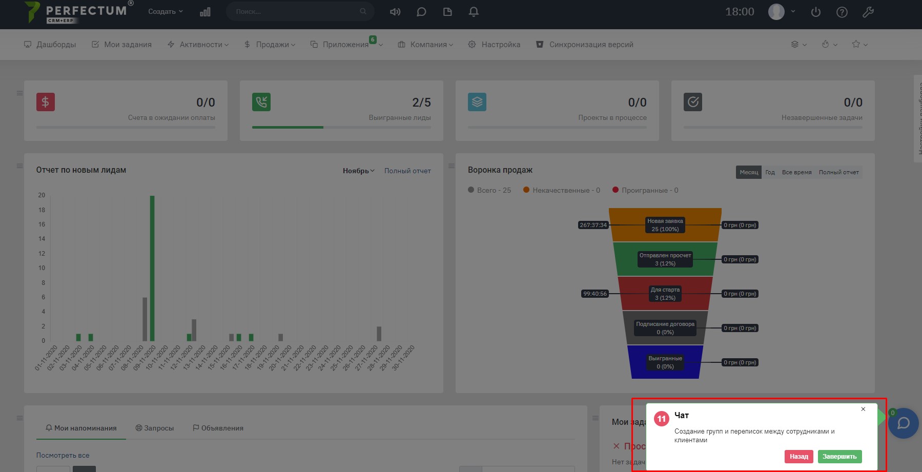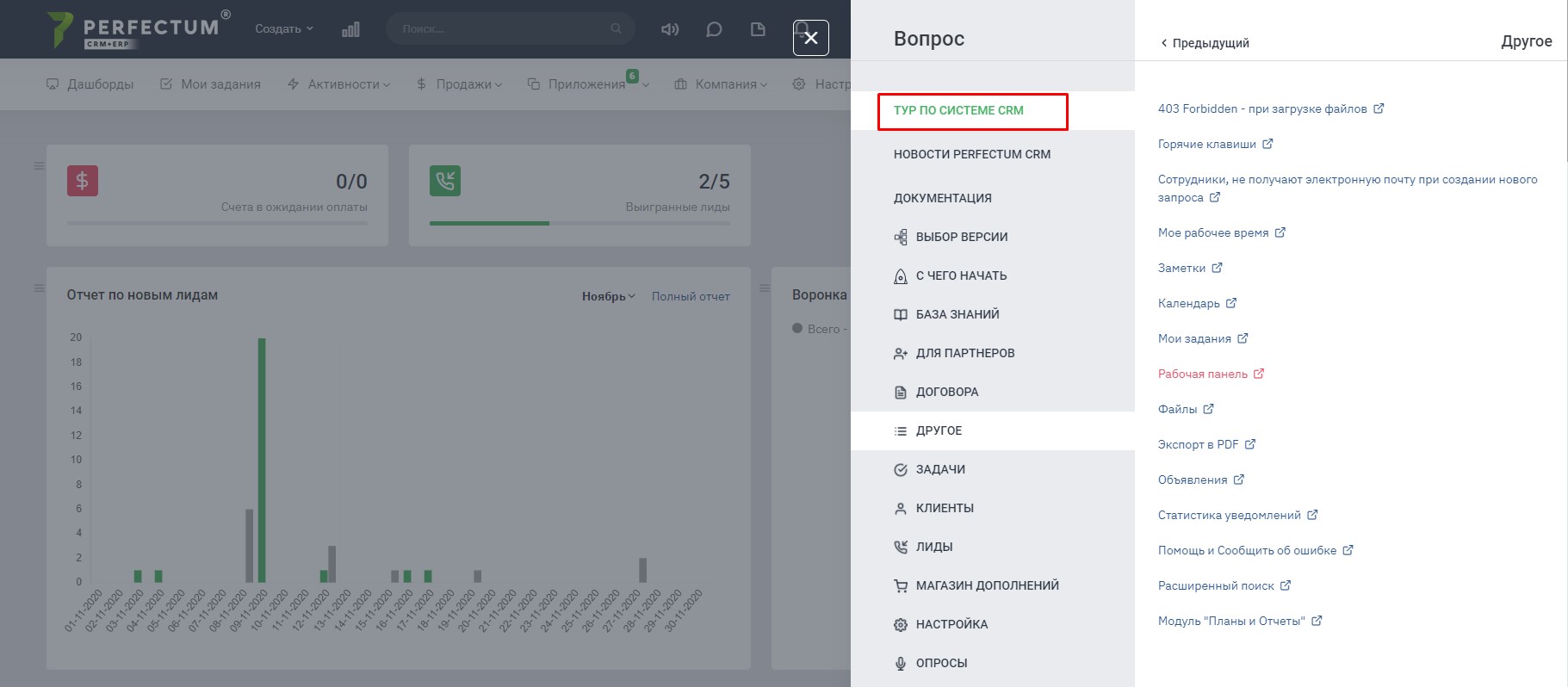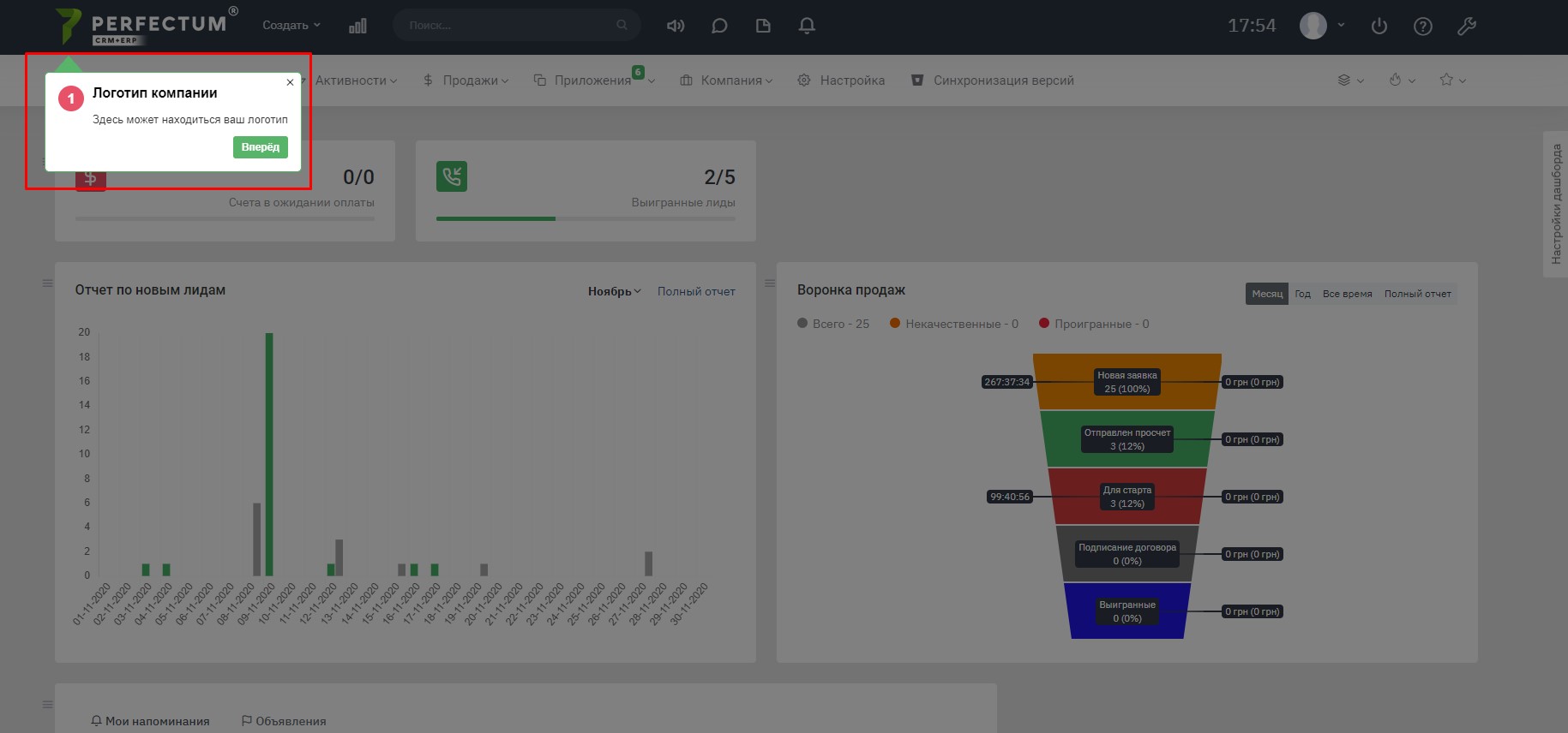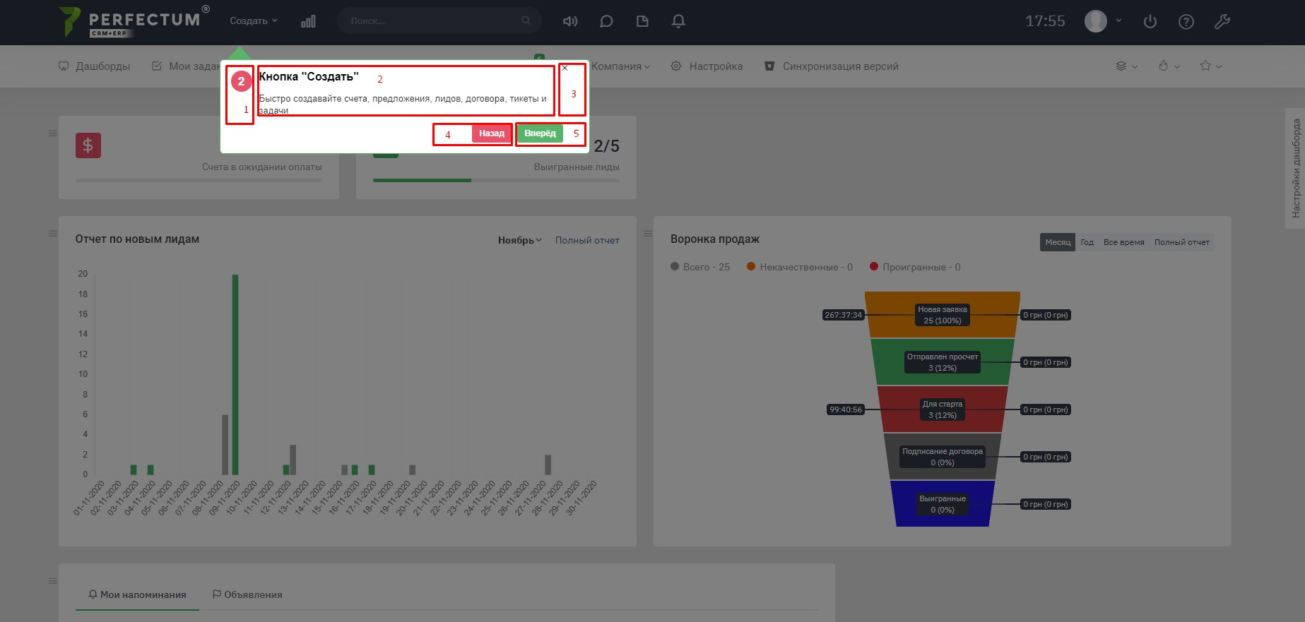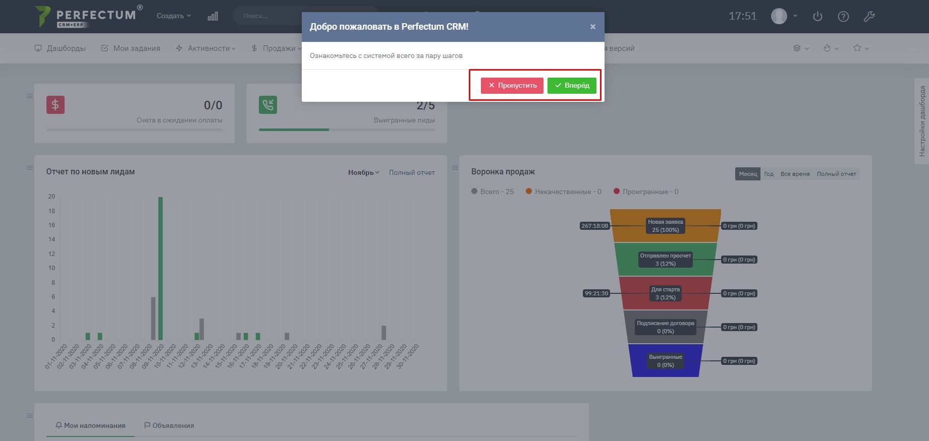 При першій авторизації в Perfectum CRM + ERP Вам буде запропоновано детальне ознайомлення з системою. При бажанні ознайомитися Вам потрібно натиснути на кнопку "Вперед", якщо такої потреби немає - натисніть "Пропустити".