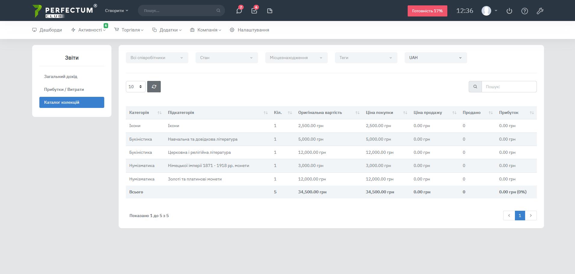 Звіт за каталогом колекцій дозволяє переглянути звіт з ваших колекцій окремо чи загалом по співробітниках, за станом, розташуванням чи валютою.