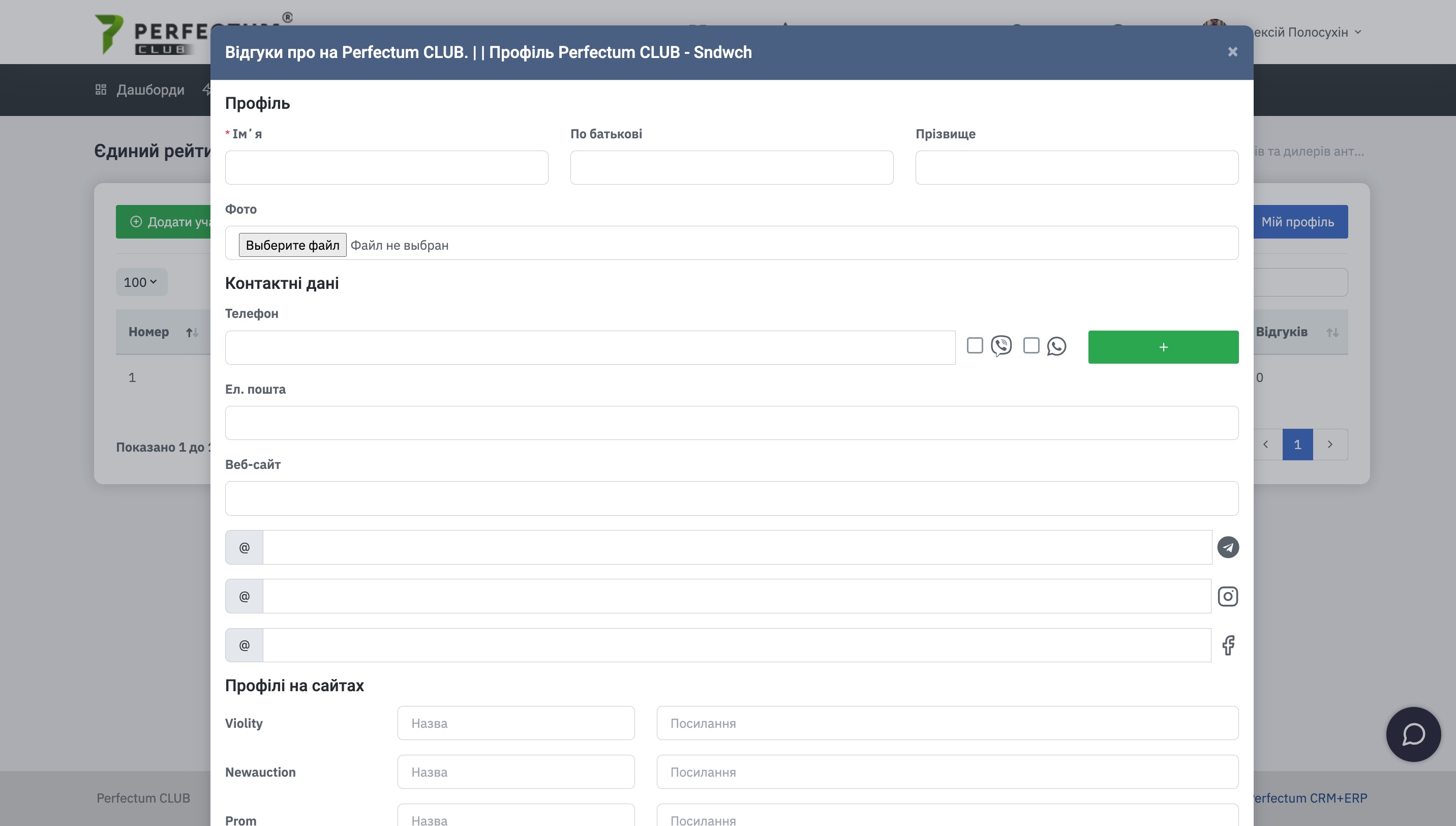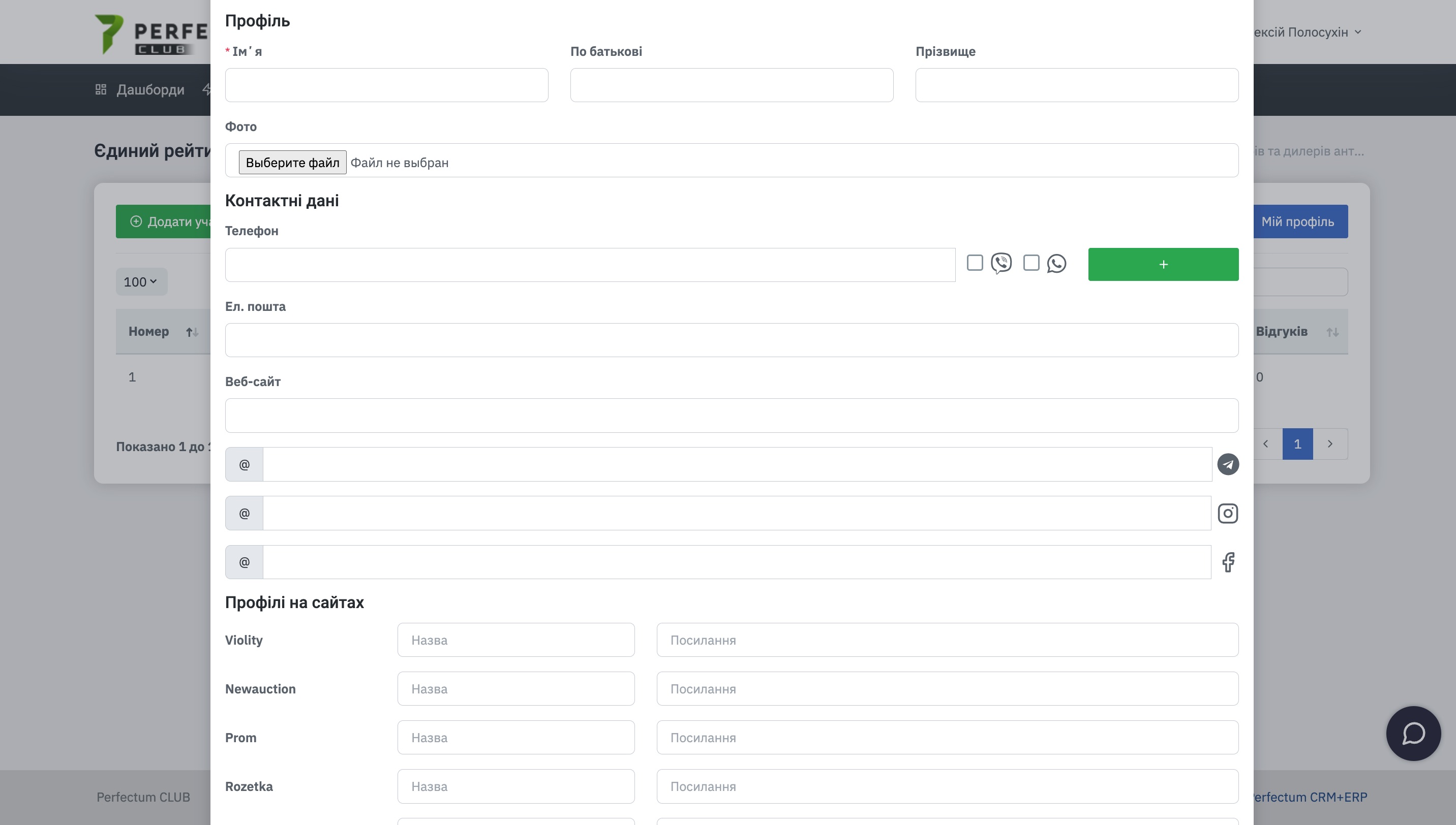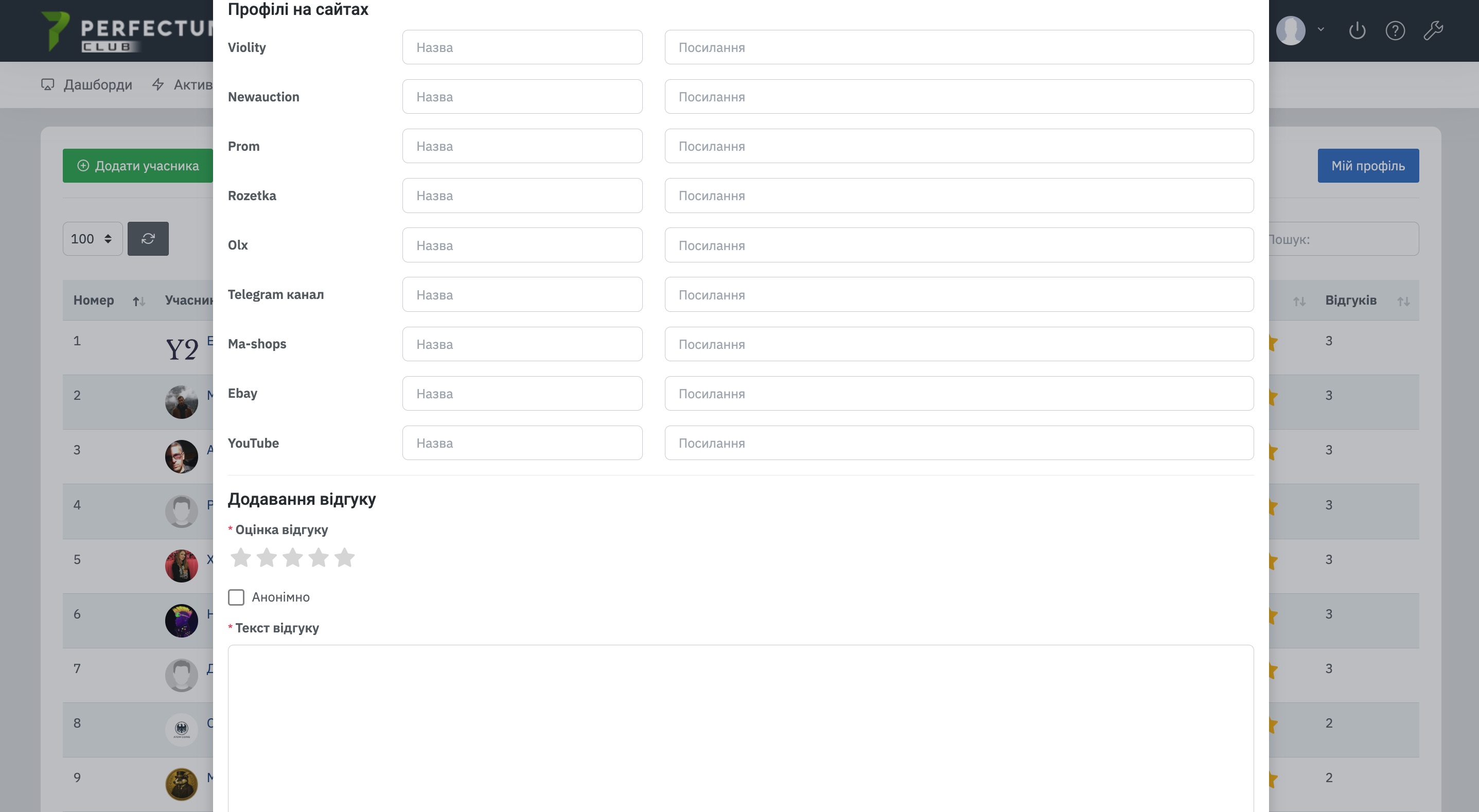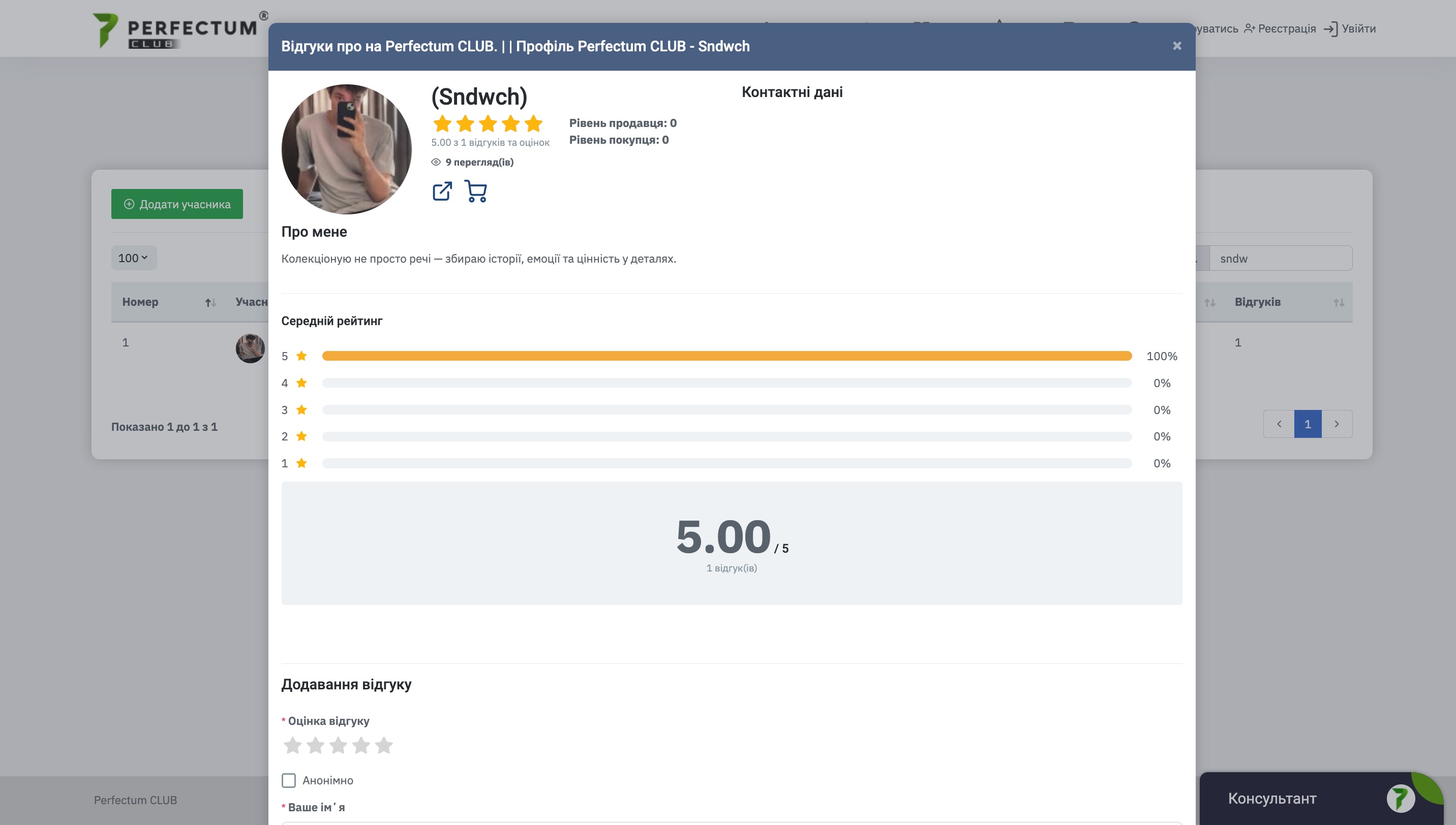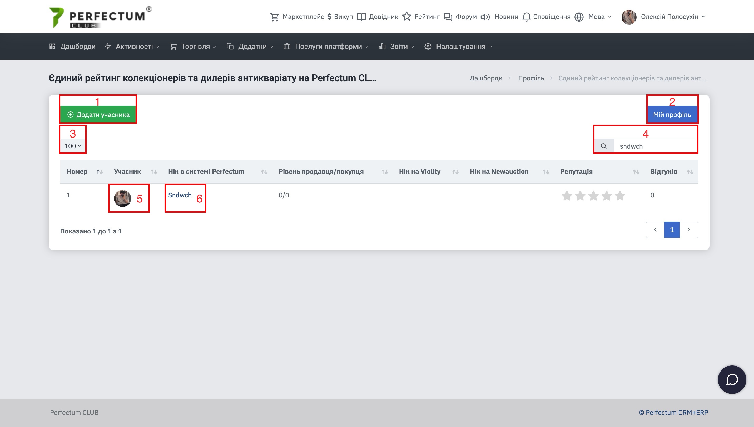 - Кнопка "Додати учасника" - дозволяє додати учасника до рейтингу/додати відгук про купівлю лота, якщо учасника немає в Perfectum Club.