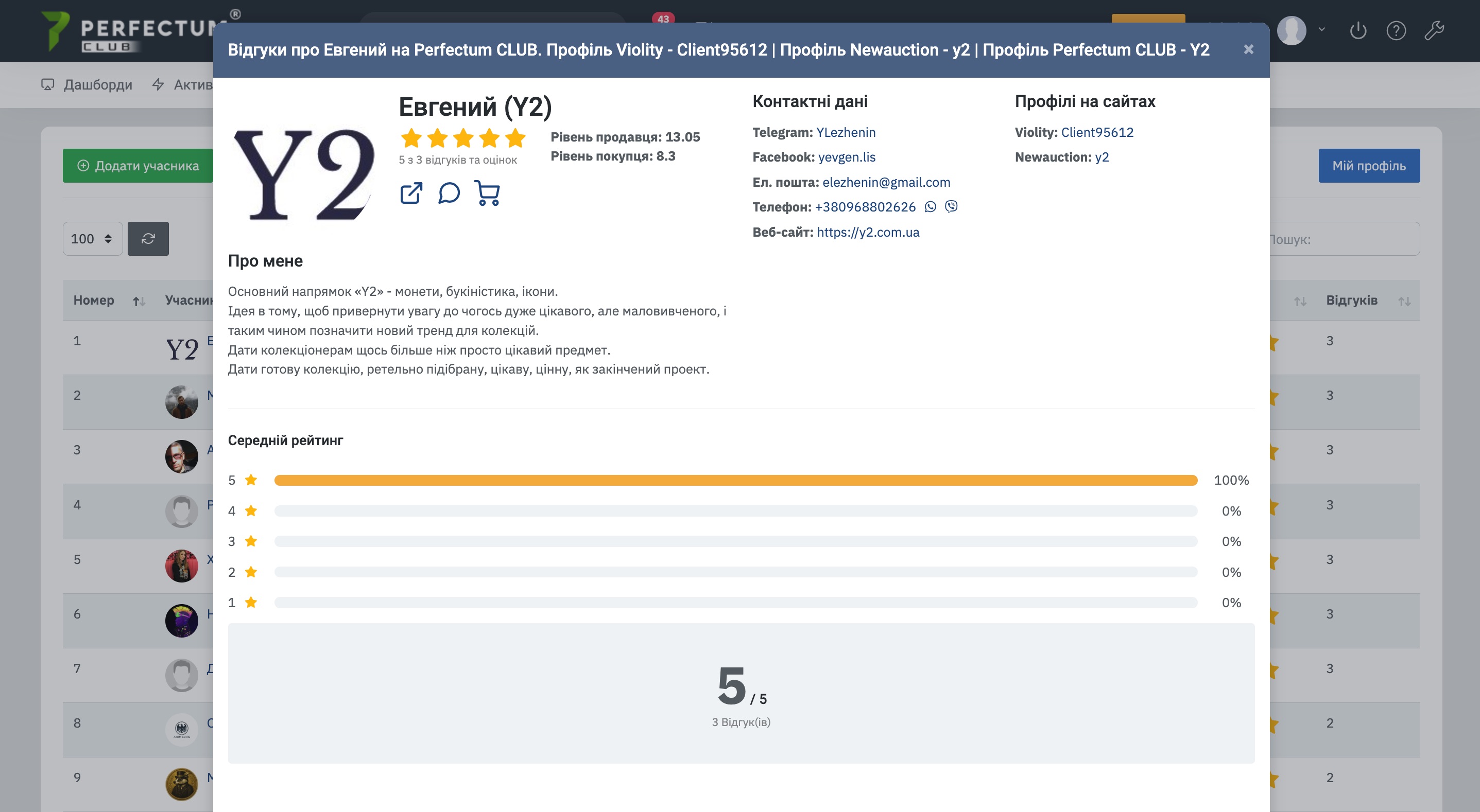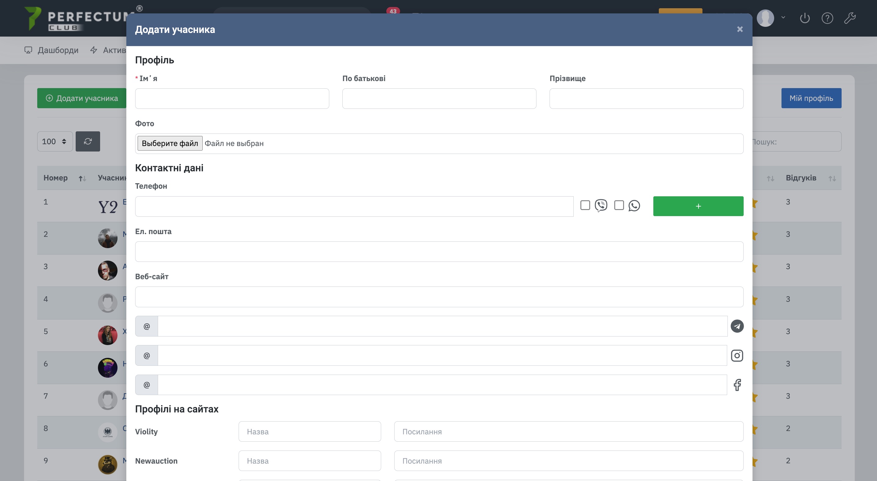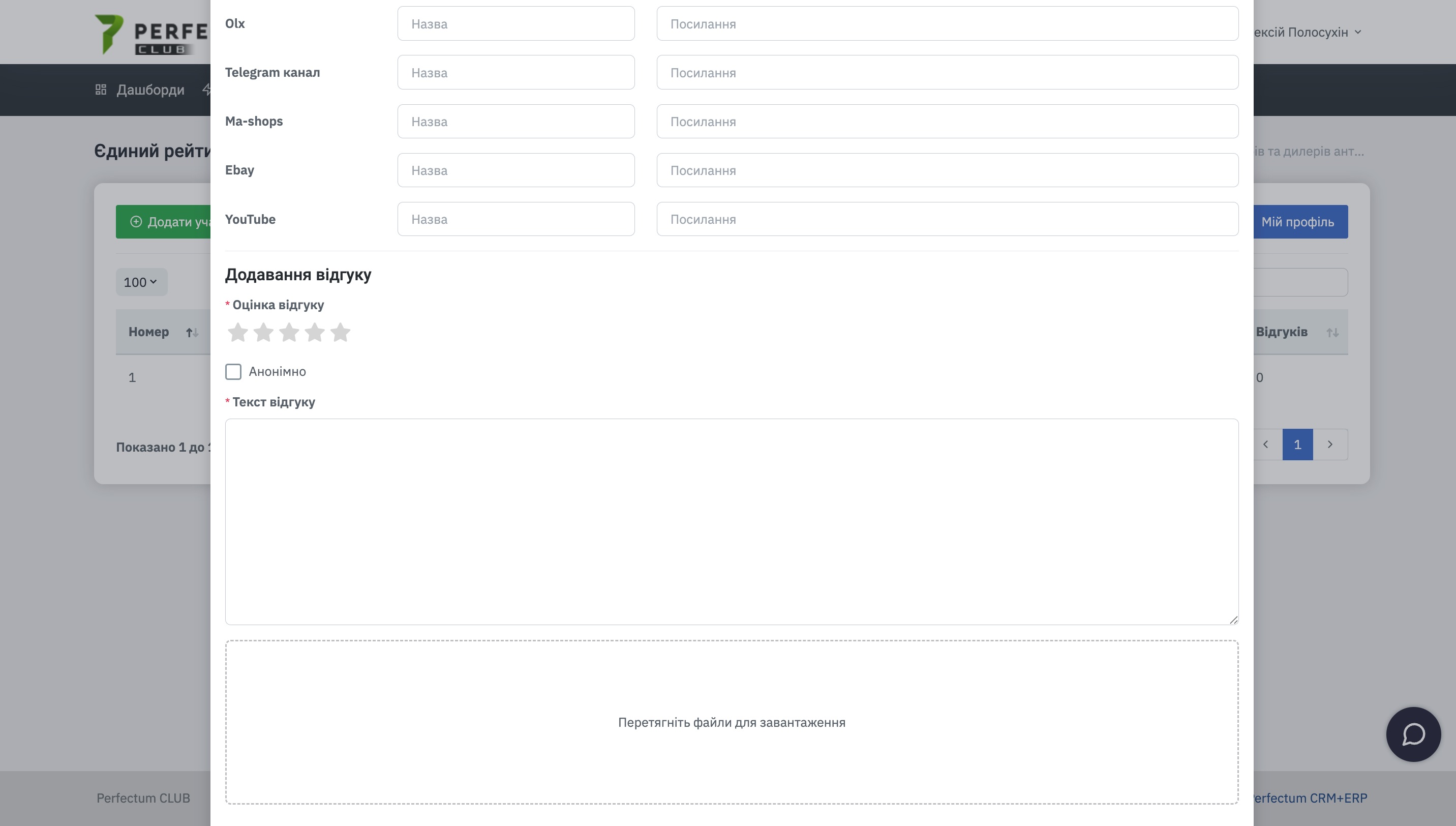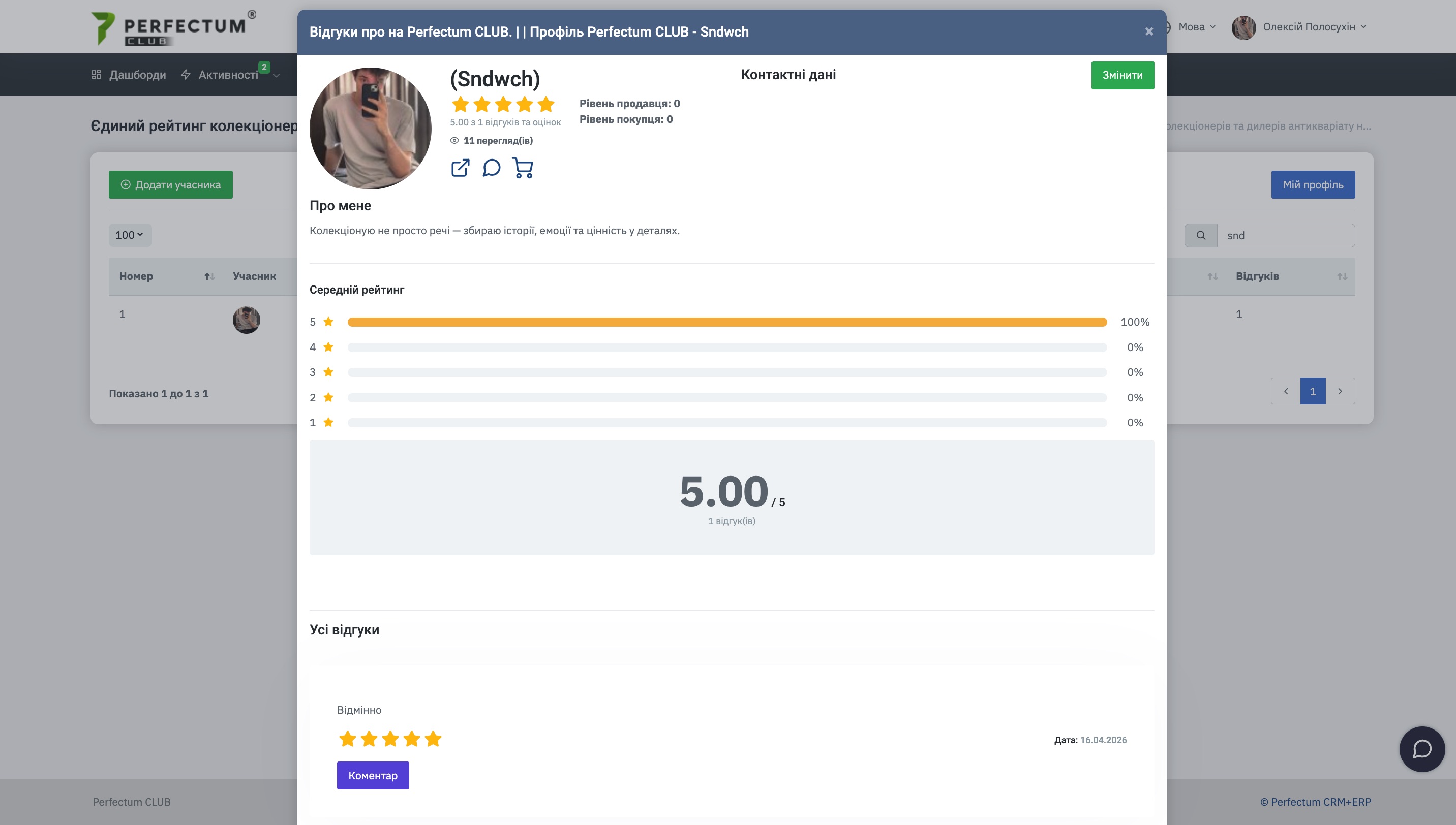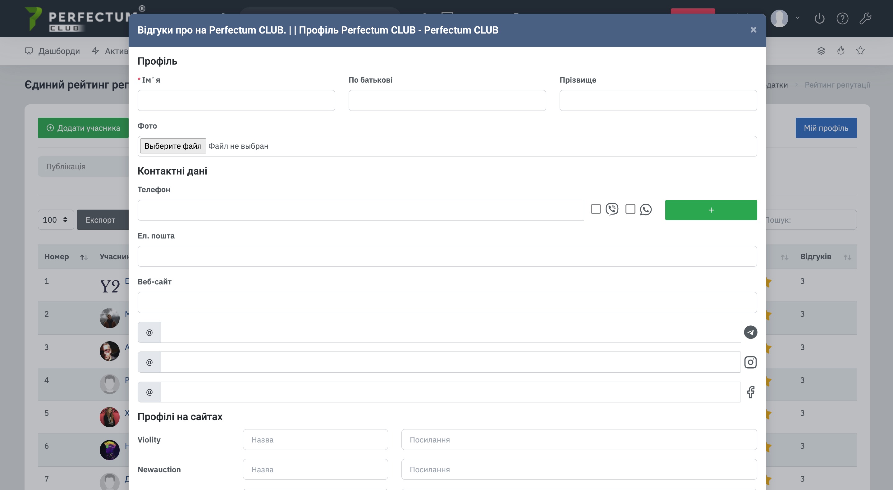 - Кнопка "Додати учасника" - дозволяє додати учасника до рейтингу/додати відгук про купівлю лота, якщо учасника немає в Perfectum Club.