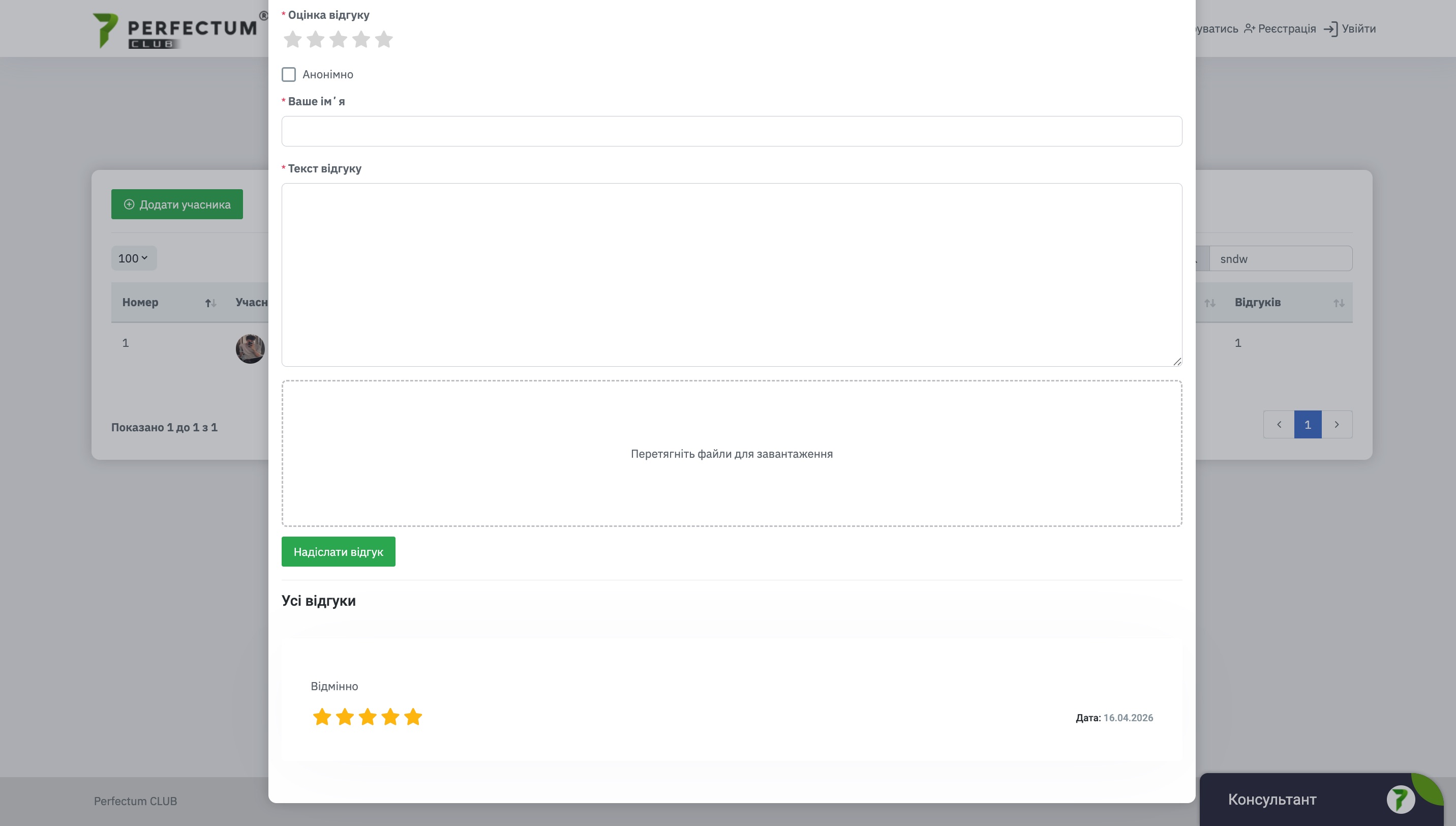 - Чекбокс "Анонімно" - дозволяє залишити відгук анонімно.