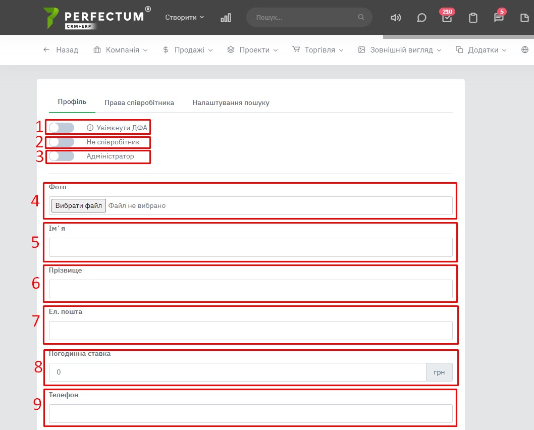 *** - відділ співробітника можна вибрати з існуючих відділів у системі за наявності пакету "Корпоративний портал" та "Партнерський портал".