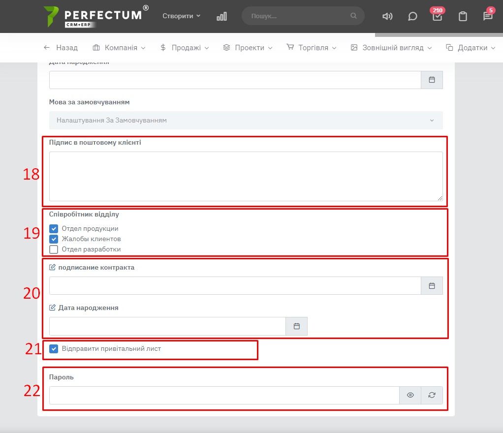 21. Чек-бокс при включенні якого надсилається автоматичний лист з доступом до системи. Для коректної роботи параметра увімкніть у шаблонах електронних листів - "Створення нового співробітника (вітальний лист)", а також налаштуйте SMTP у службових Email.