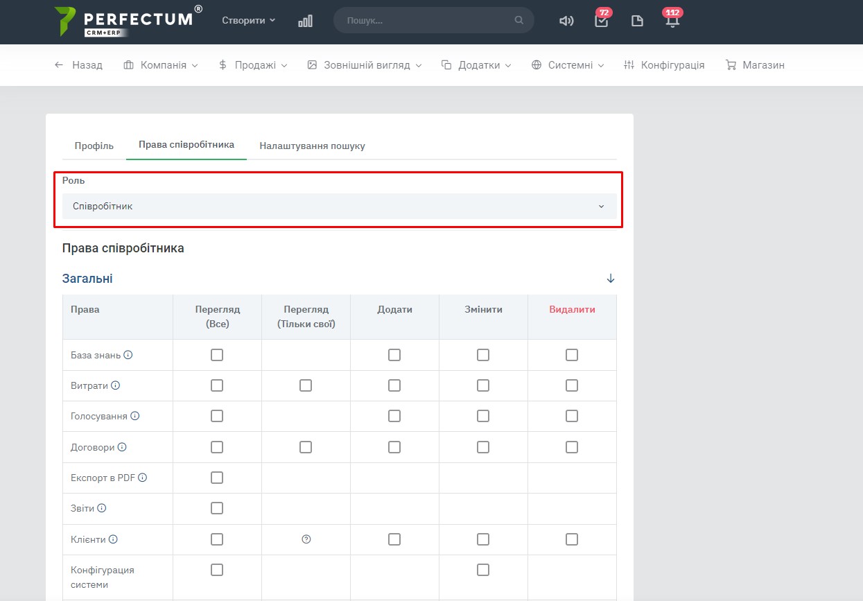 Перейдіть до розділу «Права співробітника», щоб встановити необхідні дозволи до системи. Ви можете вибрати одну зі створених ролей, щоб застосувати до співробітника права цієї ролі. Для адміністраторів не потрібно налаштовувати права доступу.