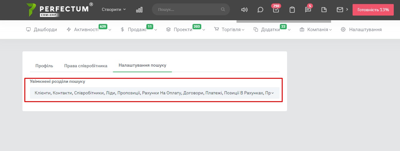 Перейдіть у вкладку «Налаштування пошуку», щоб задати по яких розділах співробітнику буде доступний розумний пошук.
