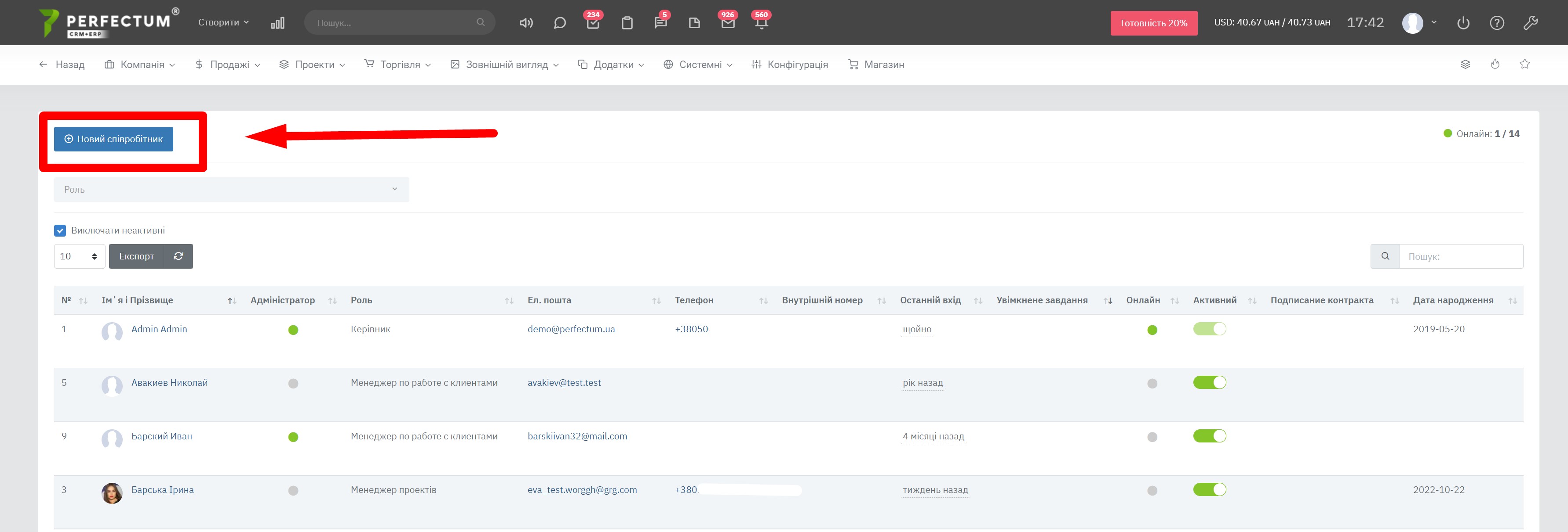 Для створення нового співробітника, Вам потрібно перейти в «Налаштування -> Компанія -> Співробітники». Далі натисніть на кнопку в верхньому лівому кутку «Новий співробітник».