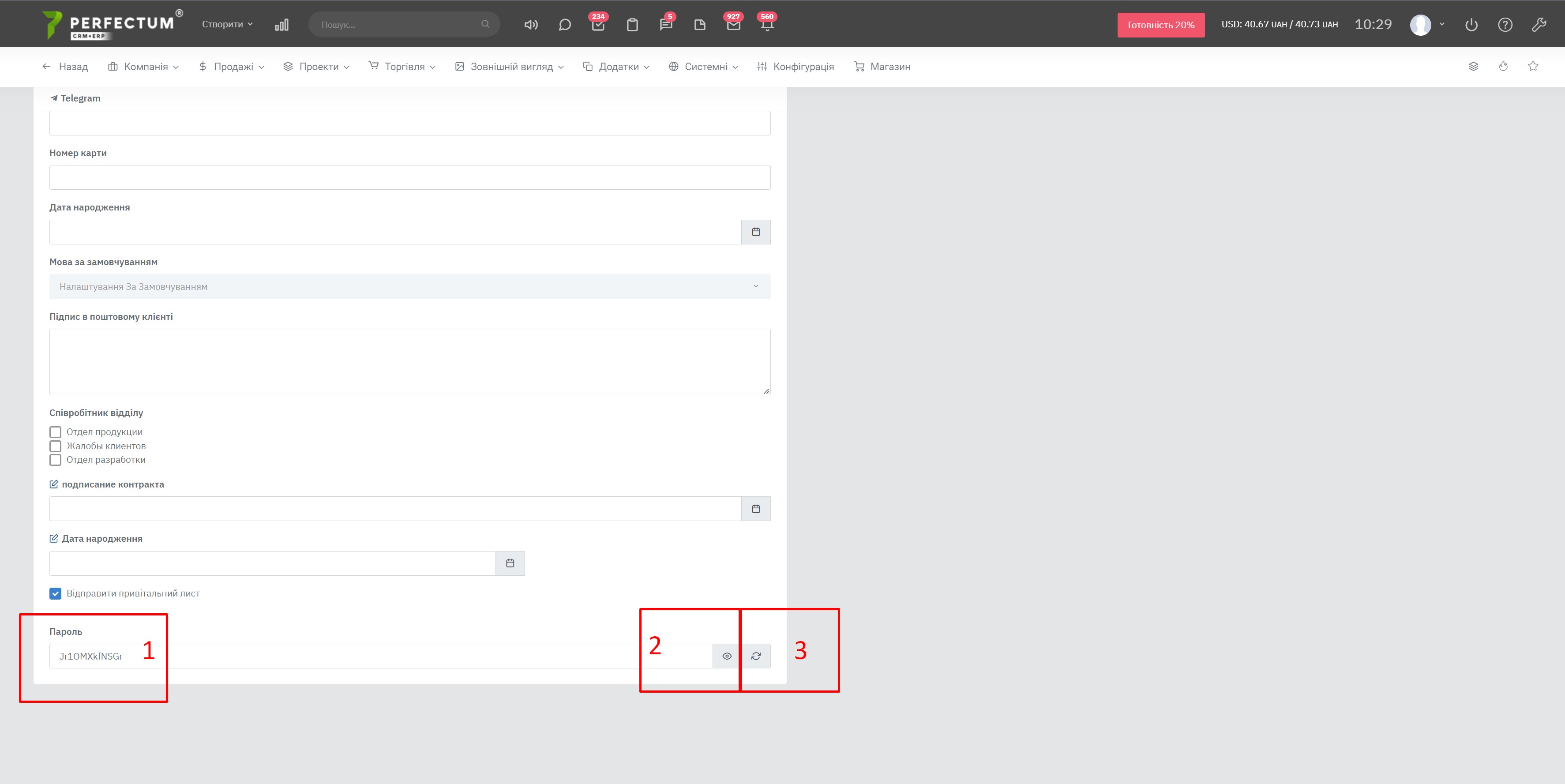 Для створення нового пароля співробітника доступні функції: