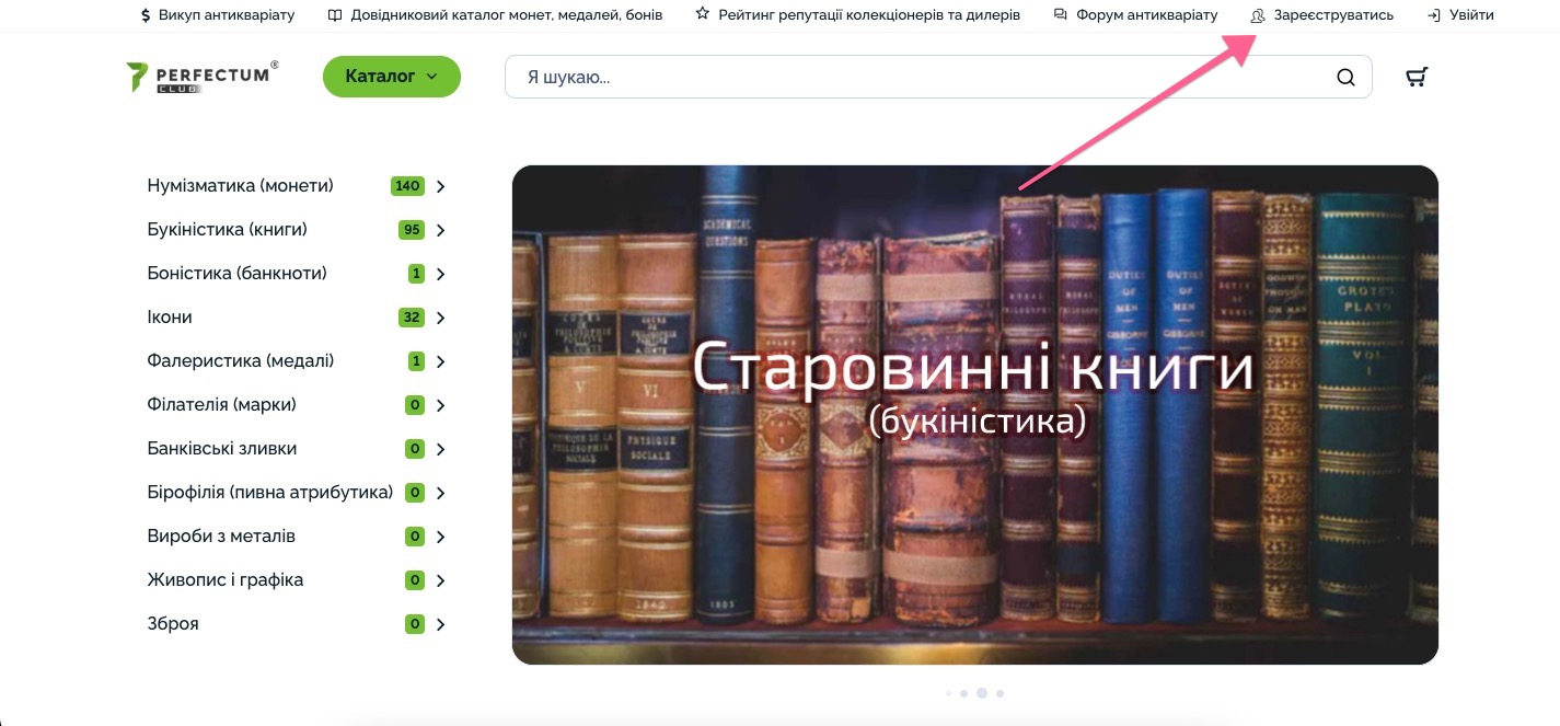 На головній сторінці сайту у верхньому меню вам необхідно натиснути на посилання "Зареєструватись".