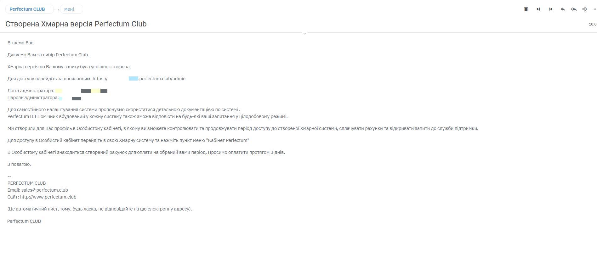 Після успішної реєстрації хмарної версії системи ви отримаєте сповіщення про це на сайті, а також лист з даними авторизації на вказану у формі пошту.