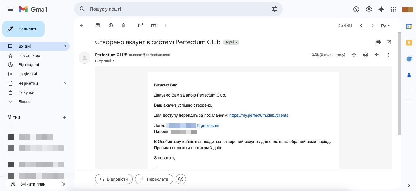 Після успішної реєстрації акаунту в системі ви отримаєте повідомлення про це на сайті, а також лист із даними авторизації на вказану у формі пошту.
