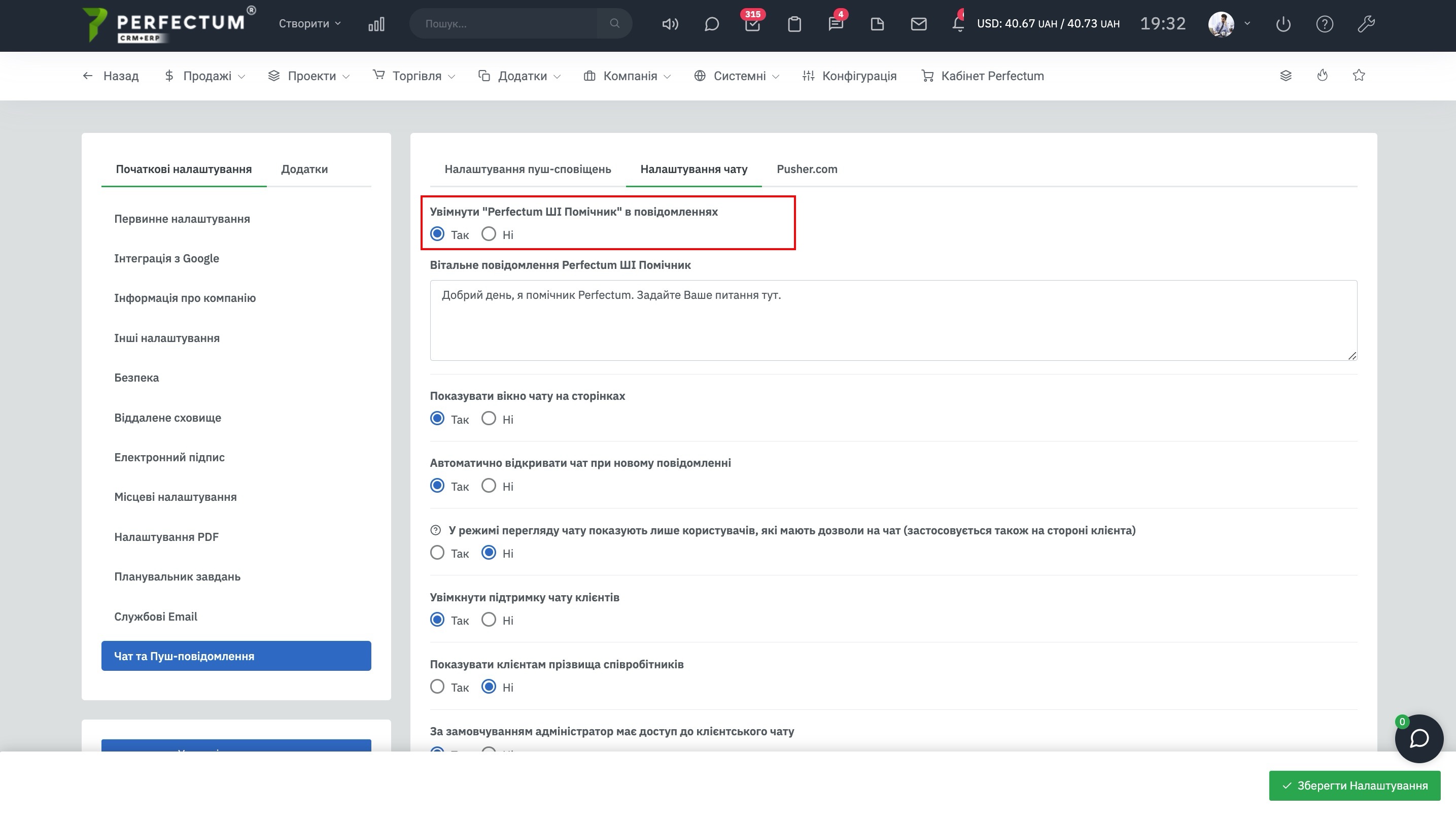 Далі перейдіть по шляху "Налаштування - Конфігурація - Чат і Пуш-повідомлення" та активуйте ШІ помічника.